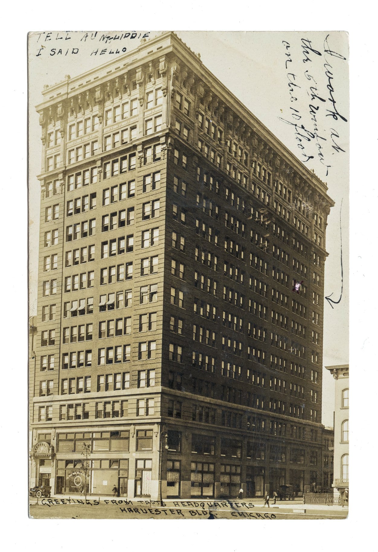 early 20th century real photo postcard of christian a. eckstorm’s 1902 international harvester company headquarters building and holabird and roche’s 1915 century building.