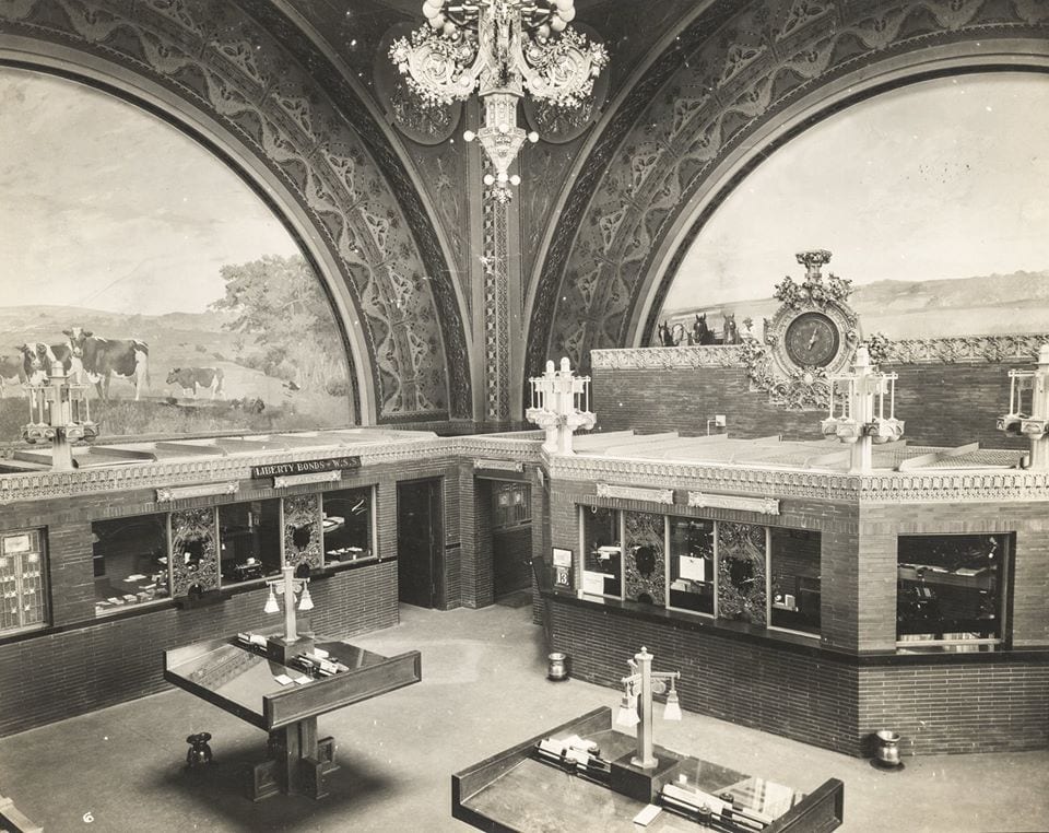 the bank’s ornament (including murals) was designed by sullivan, george elmslie, louis millet, and oskar gross.