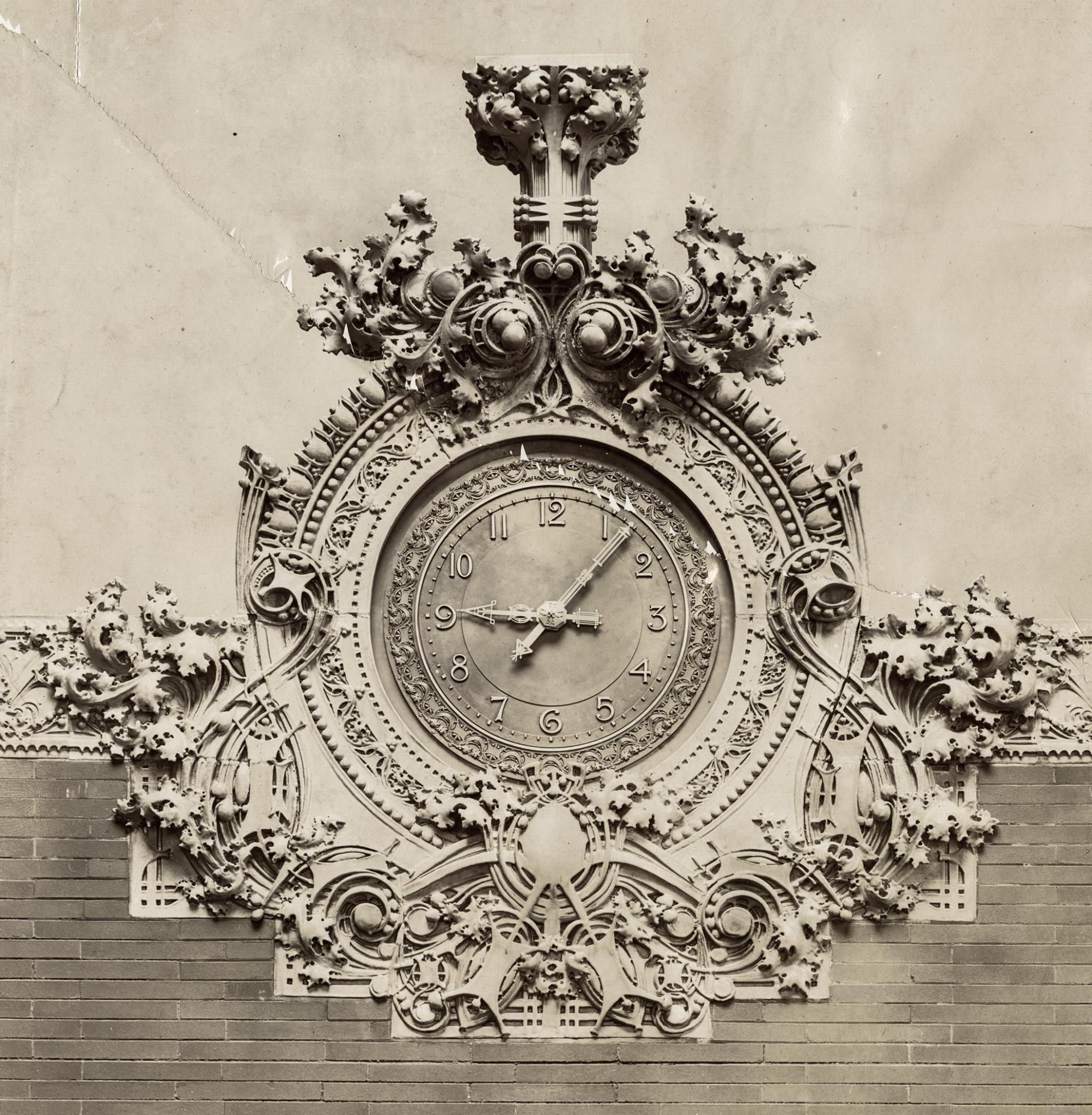 sections of the richly foliated exterior staff (e.g., column capital segments and frieze panels) were saved by richard nickel and charlie gregerson during demolition.