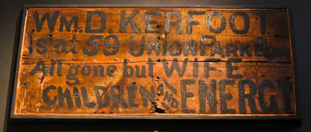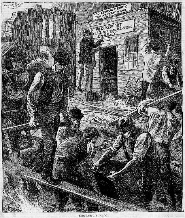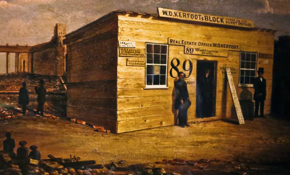 the above sign, housed in the chicago history museum, is a powerful historic artifact from the great fire of 1871: the first sign on the first building erected in the “burnt district” in the aftermath of the disaster. the man responsible for the still-surviving item was a chicagoan named william kerfoot, a well-respected and successful businessman whose real estate office and portfolio was utterly destroyed by the fire that ripped through downtown. kerfoot’s activities post-fire were indicative of the city’s wider reaction, responding by rapidly continuing business, and re-building on a grander scale than ever before.