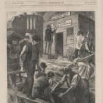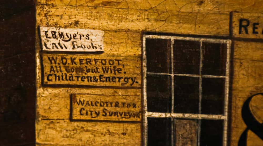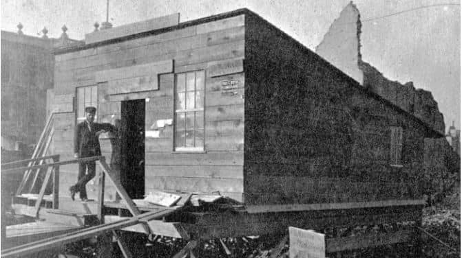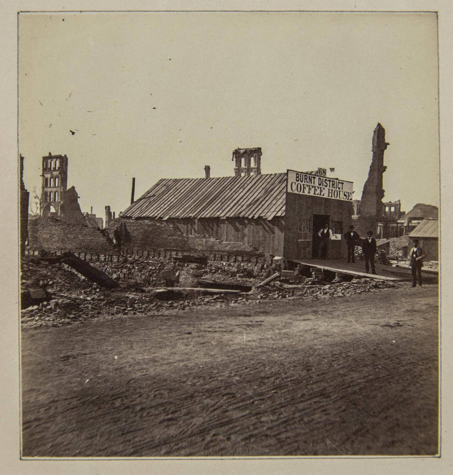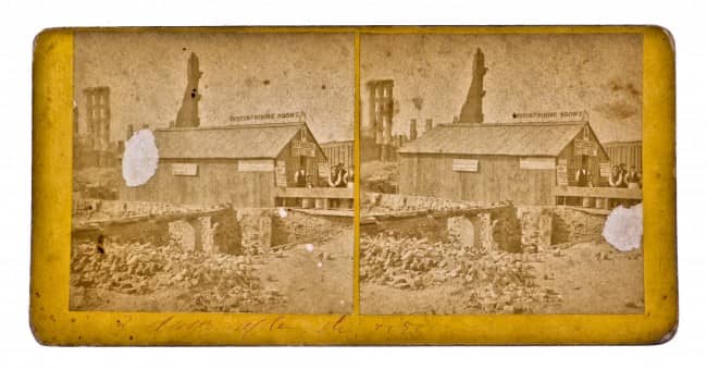 kerfoot created the wooden hand-painted sign, and another, “w.d. kerfoot’s block: first in the burned district” on shingles, and additionally placed an ad in the october 1871 chicago tribune, reading “all gone but wife, children, and energy.” though he set up shop temporarily at 36 canal street, kerfoot quickly moved back to his original place at 89 east washington street, where he purportedly had to wait for the bricks to cool before placing his wood shack on the original lot line. there, the very morning after the fire had ceased, kerfoot’s shanty became a haven for other destitute chicagoans who sought news and resources. people were magnetized to the make-shift directory hung outside. the building apparently served as an army headquarters, and all surveys of the burnt district were made from that office, re-establishing the lot lines and street lines.