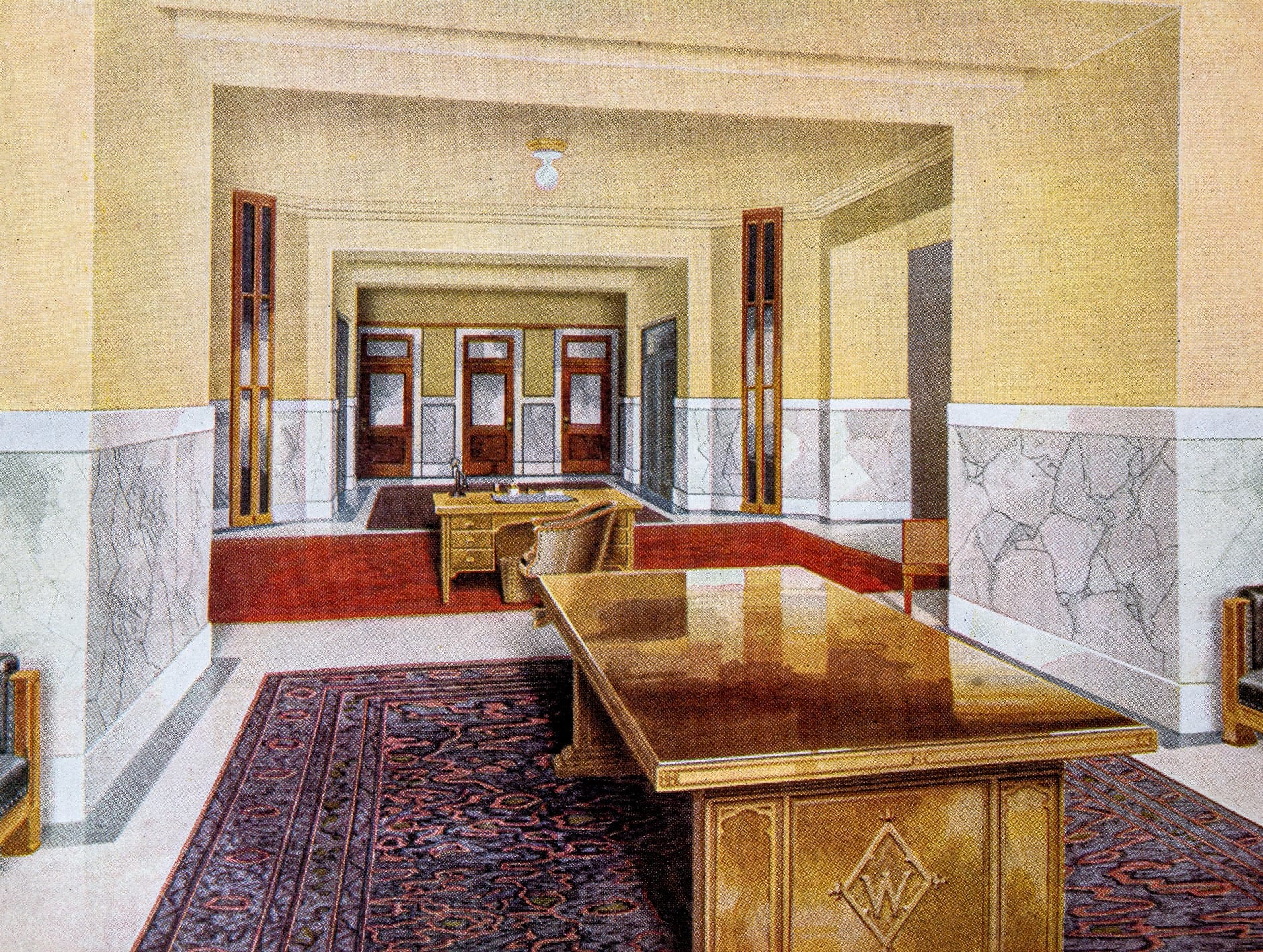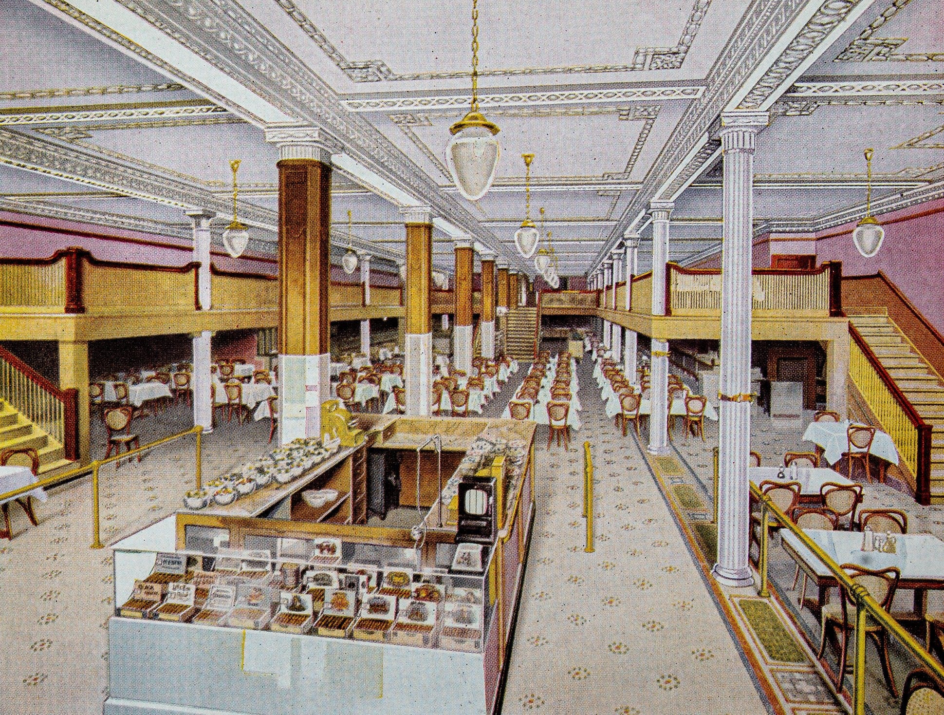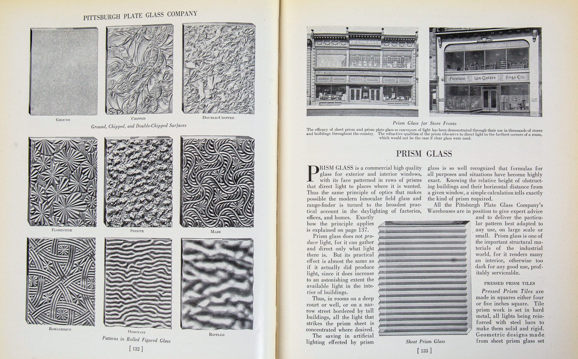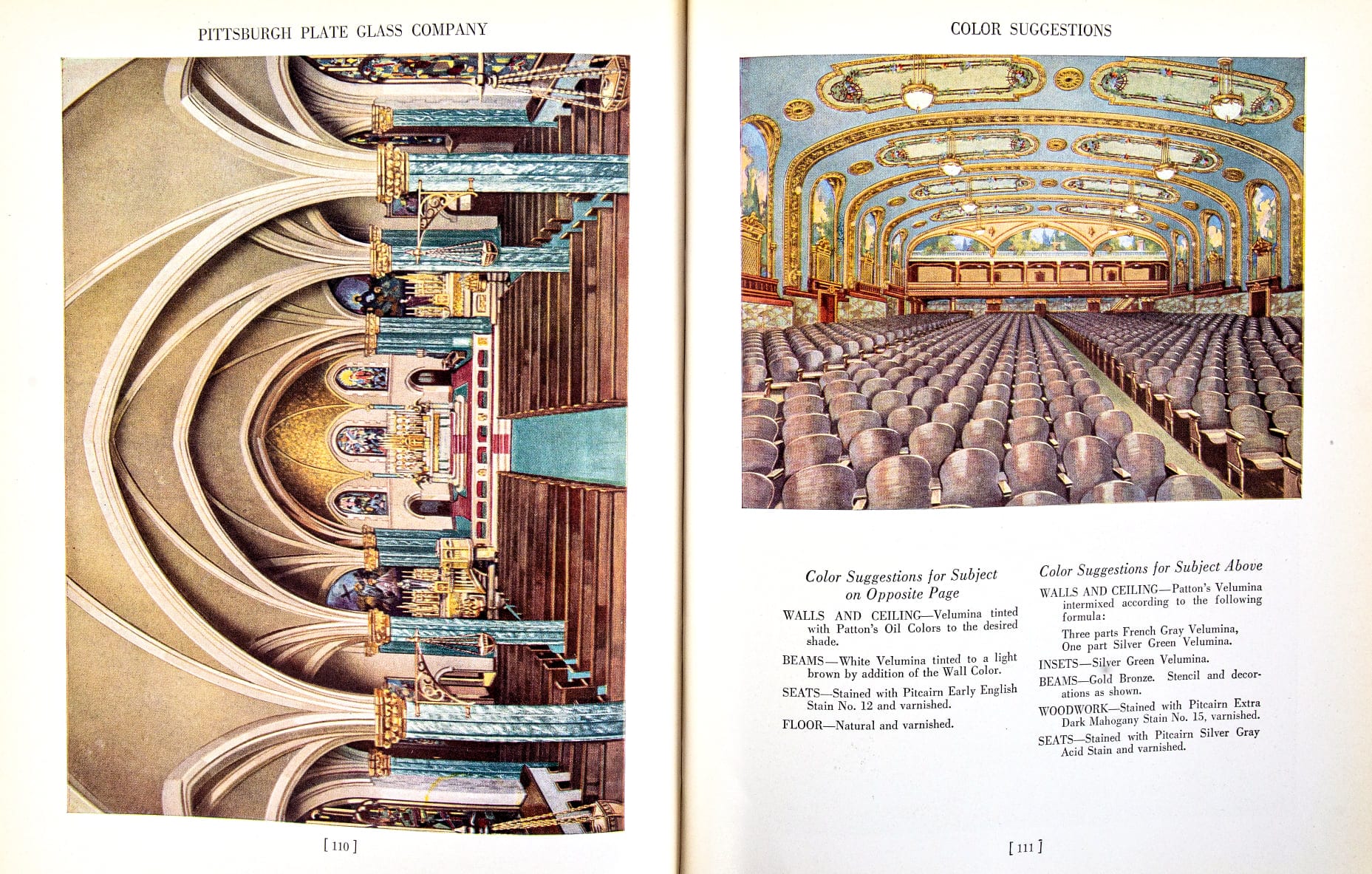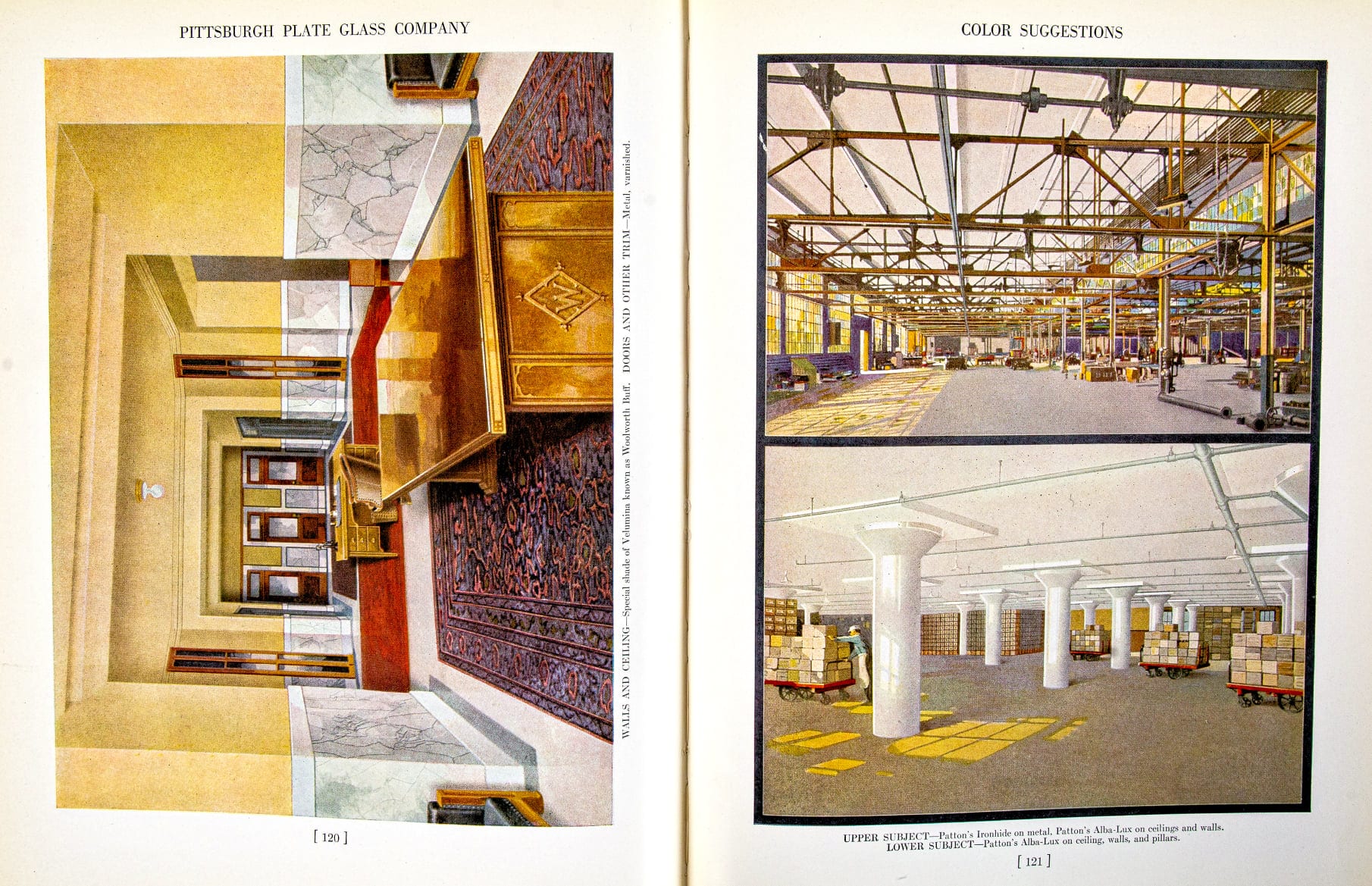 the 1923 catalog edition was designed and published by pittsburgh plate glass company, which  beautifully showcases their storefront glass, shop displays, leaded glass and paintworks with richly colored and highly detailed illustrations followed by detailed descriptions of each process and extensive options for customization.
