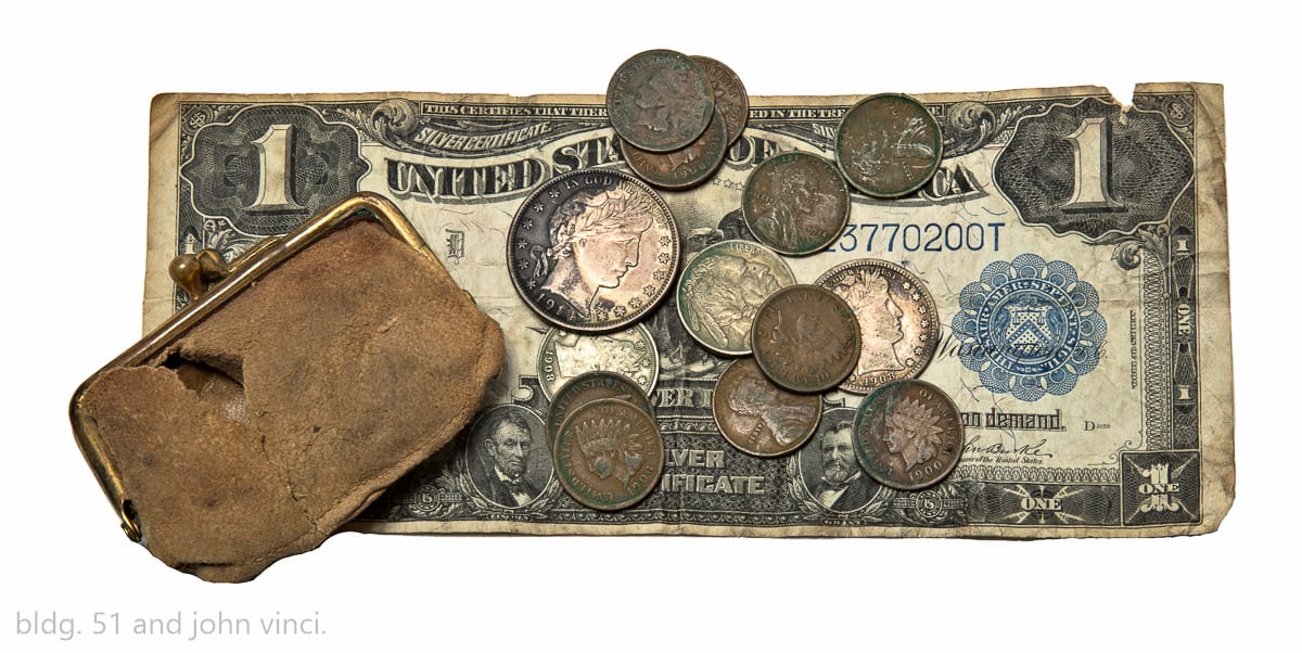thankfully john held onto the purse since the time he found it, so i was thrilled to see it person where i closely examined the contents that i then documented in the images below. while small, the leather change purse contained a fair amount of coins dating from the 1880’s. the diminutive purse, coins, and single silver dollar bill remain in great condition, considering age. judging from the dates, the purse was lost by a theatergoer in 1915.
