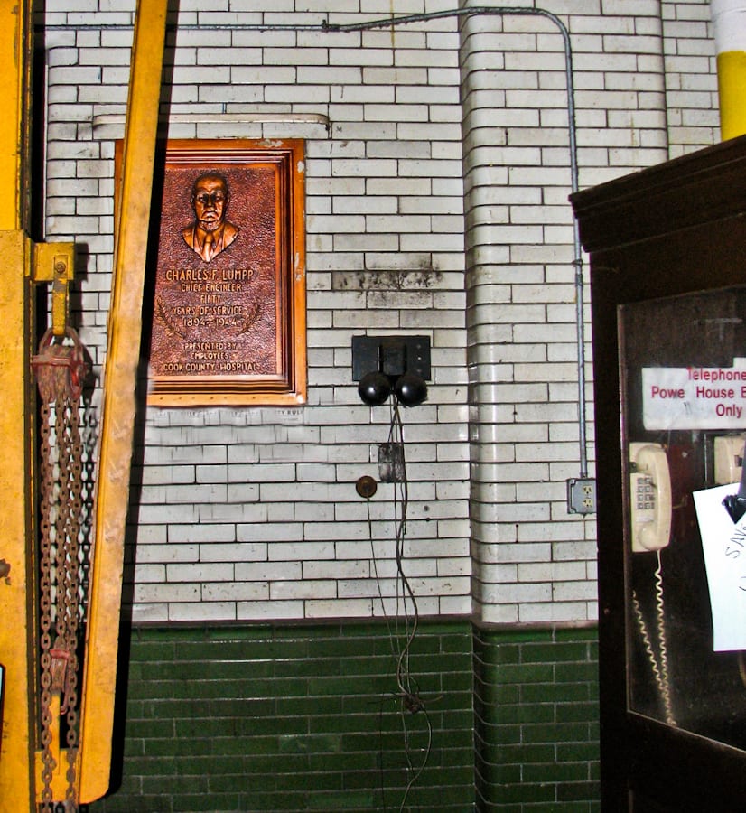 another artifact captured in situ was a commemorative plaque (believed to be saved by the city shortly before the plant’s demolition), which was added in 1944, to honor chief engineer, charles f. lumpp, for his fifty years of service to cook county hospital (from 1894-1944). if memory serves me right, the plaque was comprised of cast plaster with an “antique” metallic copper enameled finish or “wash.”