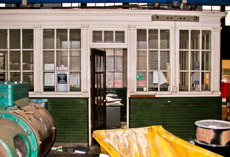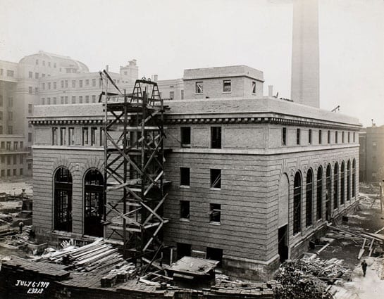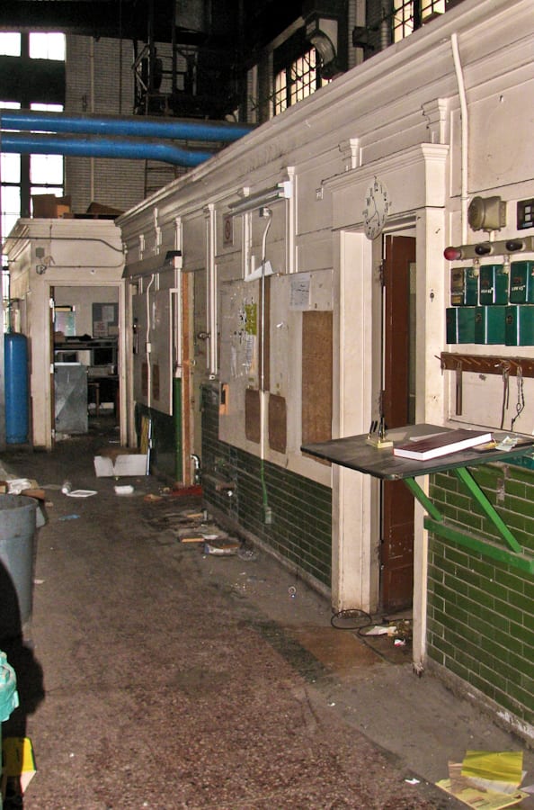 the fortified building, with its expansive interior, was designed to house the hospital’s delicate “nervous system” consisting of of a dizzying assemblage of steam pipes, boilers, switchboards, a massive overhead gantry crane, and a small collection of offices – bedecked with green and white enameled brick, neoclassical pilasters and ample natural light (for the engineers, who kept an attentive eye on the inner-workings of this complex for distributing the necessary power to keep the gargantuan hospital alive and well).