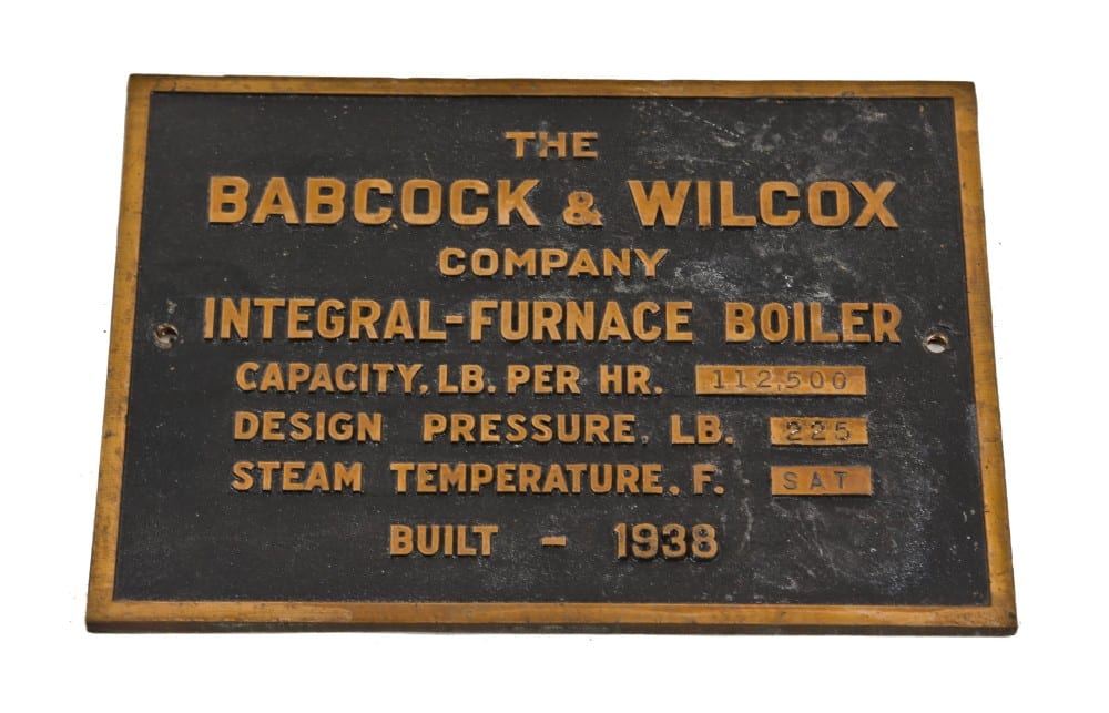 by the time i arrived, the antiquated system was slowly being powered down, as more and more areas of the surrounding hospital was stripped and shuttered in preparation for demolition. always having a soft spot for gauges, signage and plaques identifying the fabricator and/or specifications pertaining to a component’s performance, i grabbed several of these artifacts. the takeaway included the oversized babcock and wilcox boiler bronze informational plaque, added in 1938 when the hospital upgraded its power plant equipment.