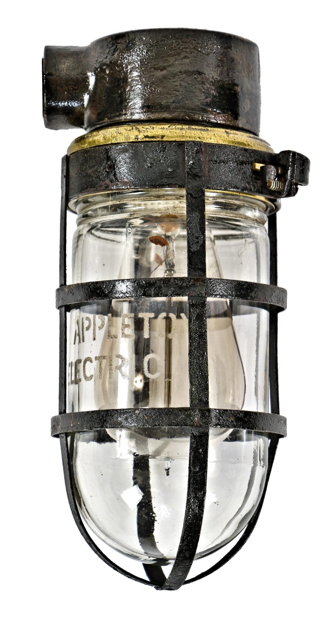 perhaps the most exciting find was an original appleton “unilet” explosion or dust-proof light fixture that was on the underside of the gantry crane. to my surprise, the fixture contained the original, or at least a very early, “tipped” incandescent light bulb with a burning bright white tungsten cage filament, still in working condition when tested.