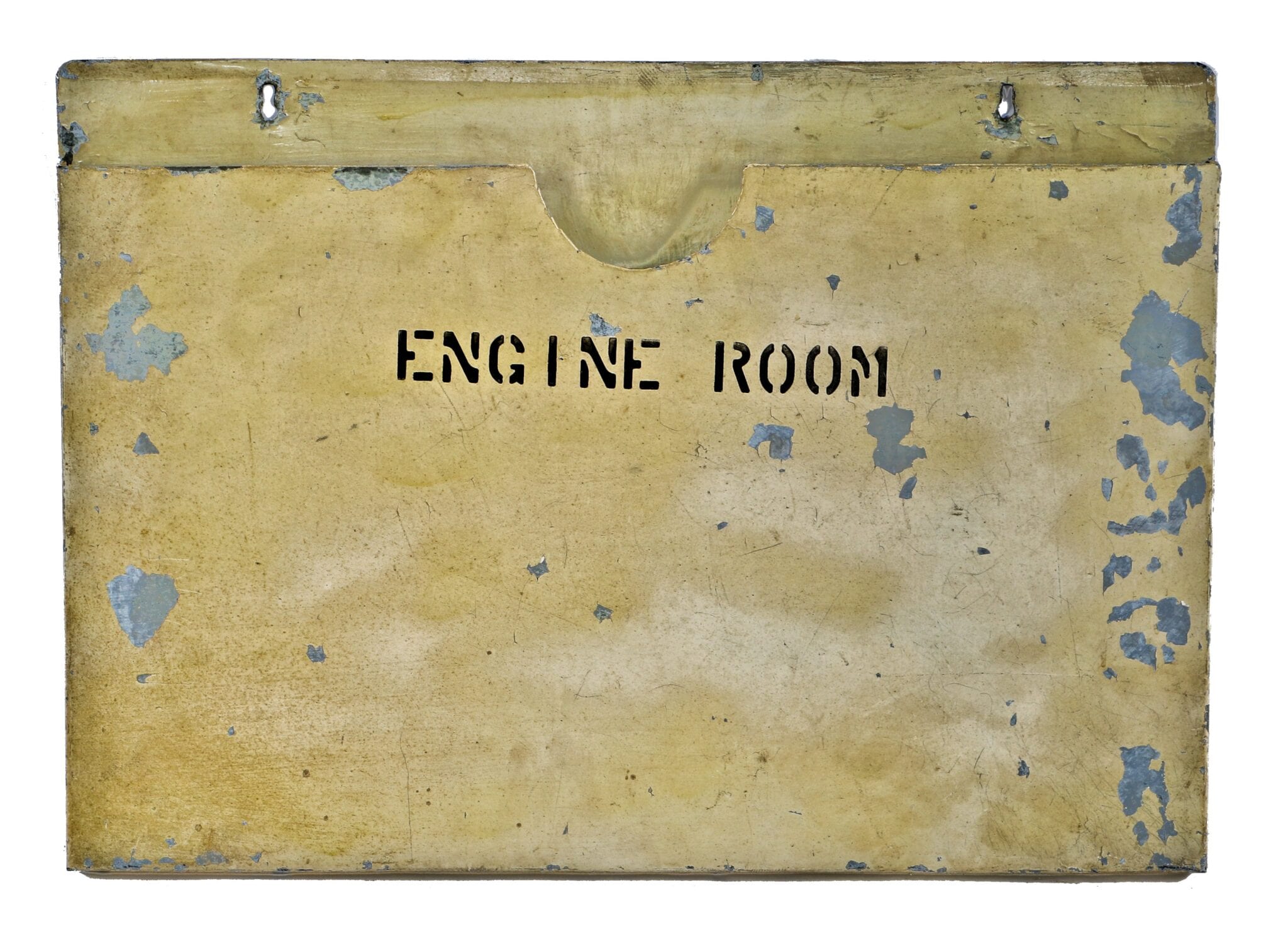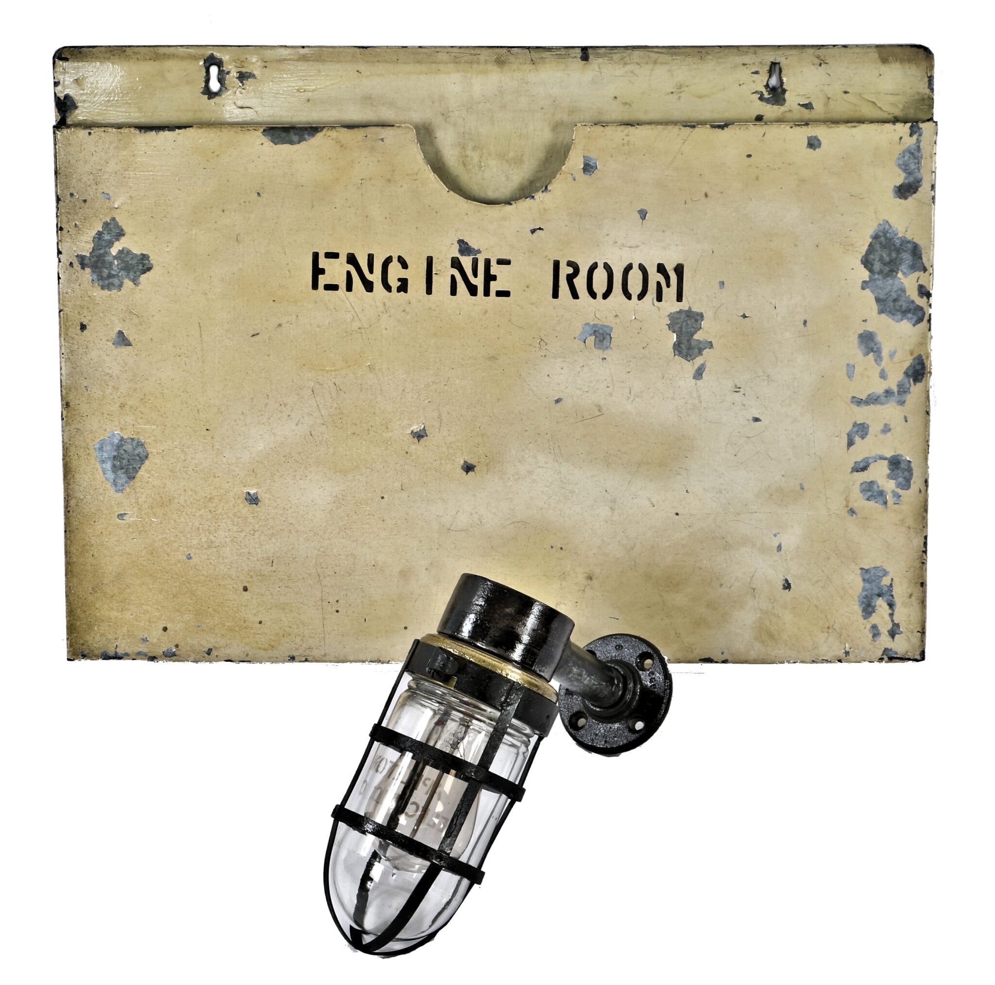 aside from the boiler plaque and appleton unilet, i held onto one other artifact that i discovered while rummaging through the mostly trashed offices. very simple and utilitarian in both appearance and functionality, i was instantly attracted to this crudely made, pressed and folded galvanized steel wall-mount folder that once held a bunch of complicated schematics. the most distinctive feature, which provides a certain distinctiveness or “character,” are the words “engine room” archaically stenciled in black paint across the front of the sleeve.