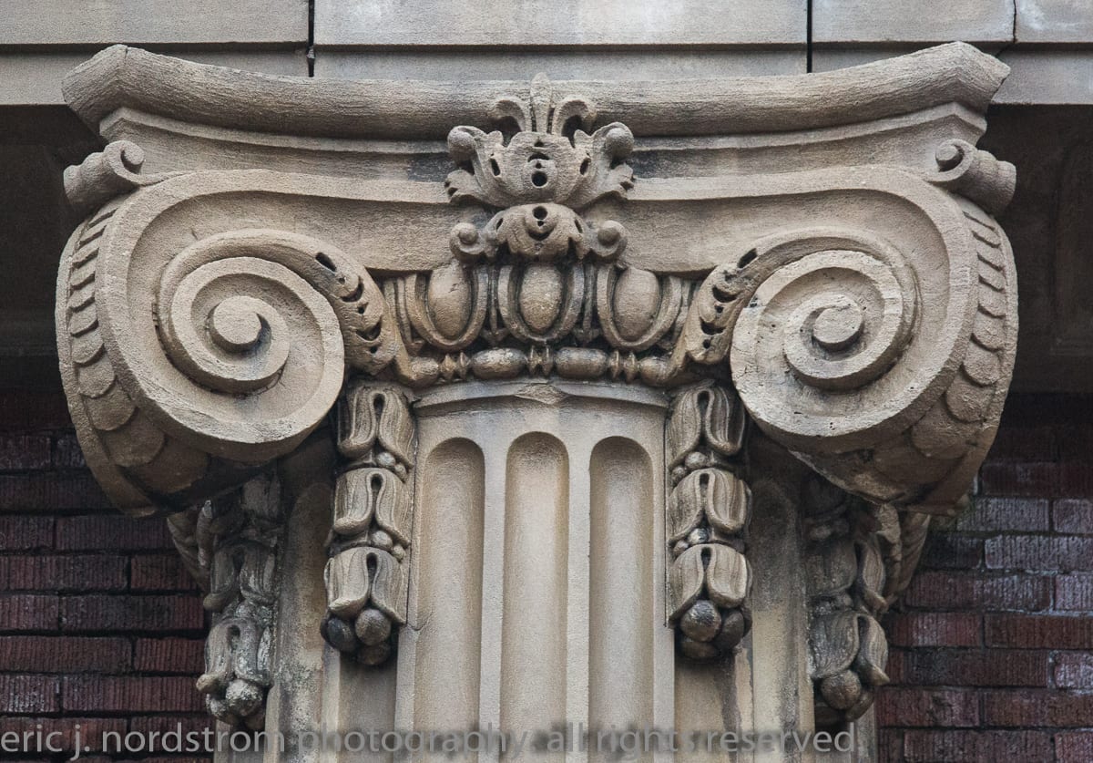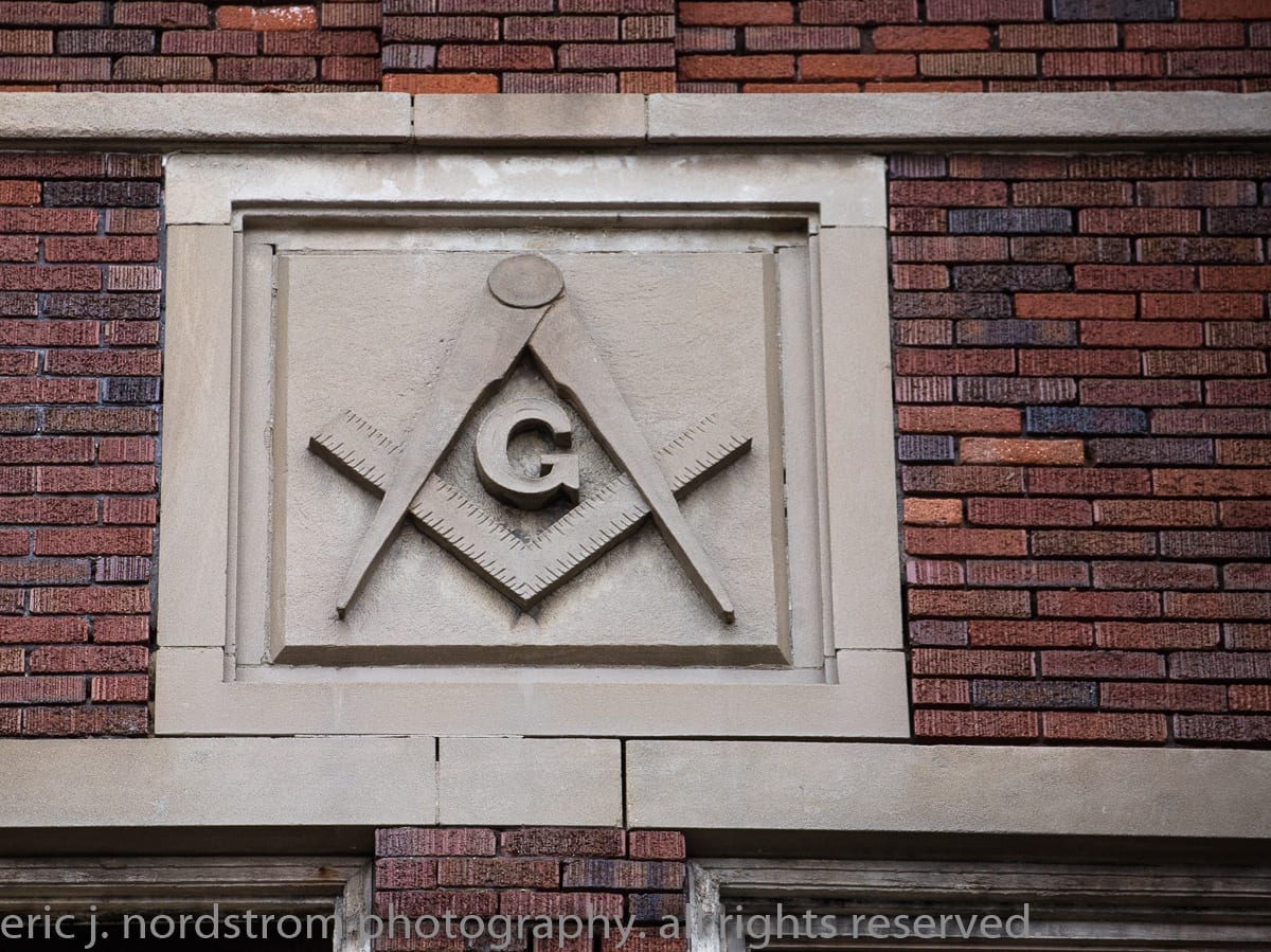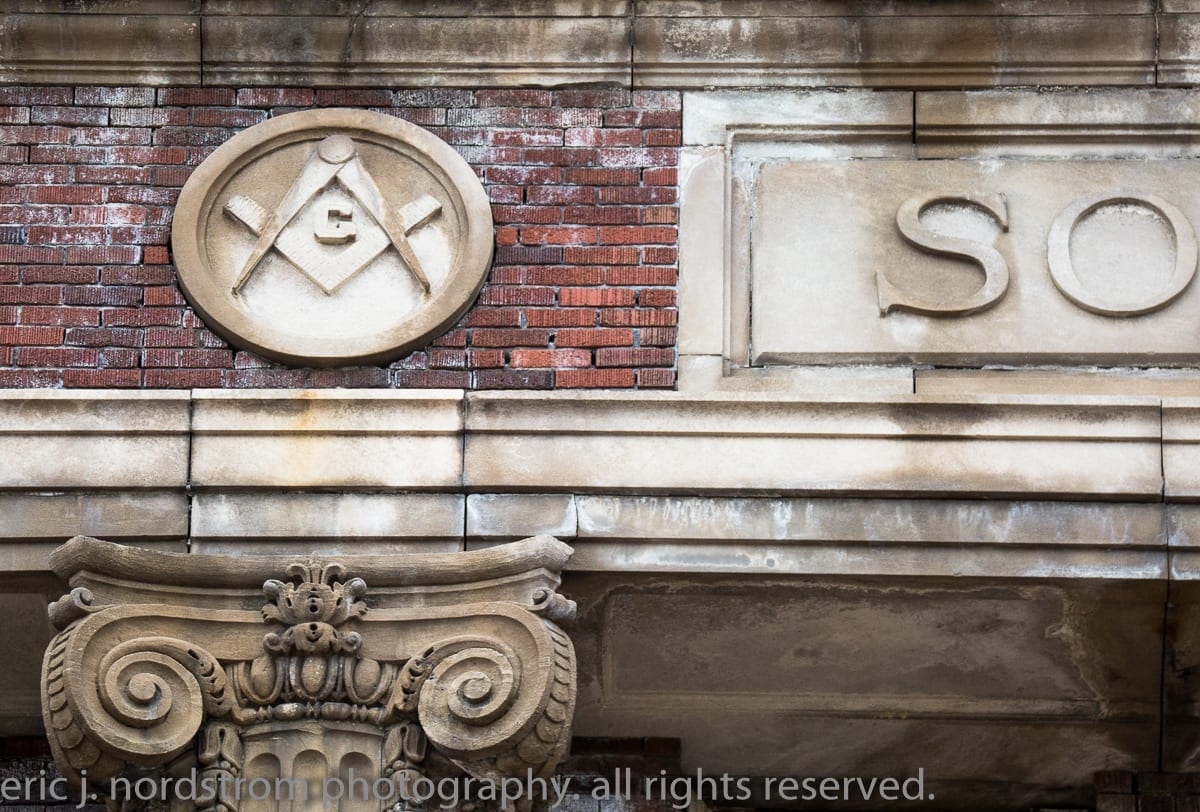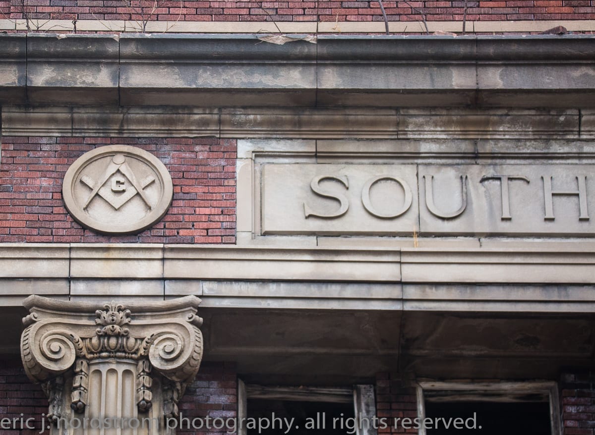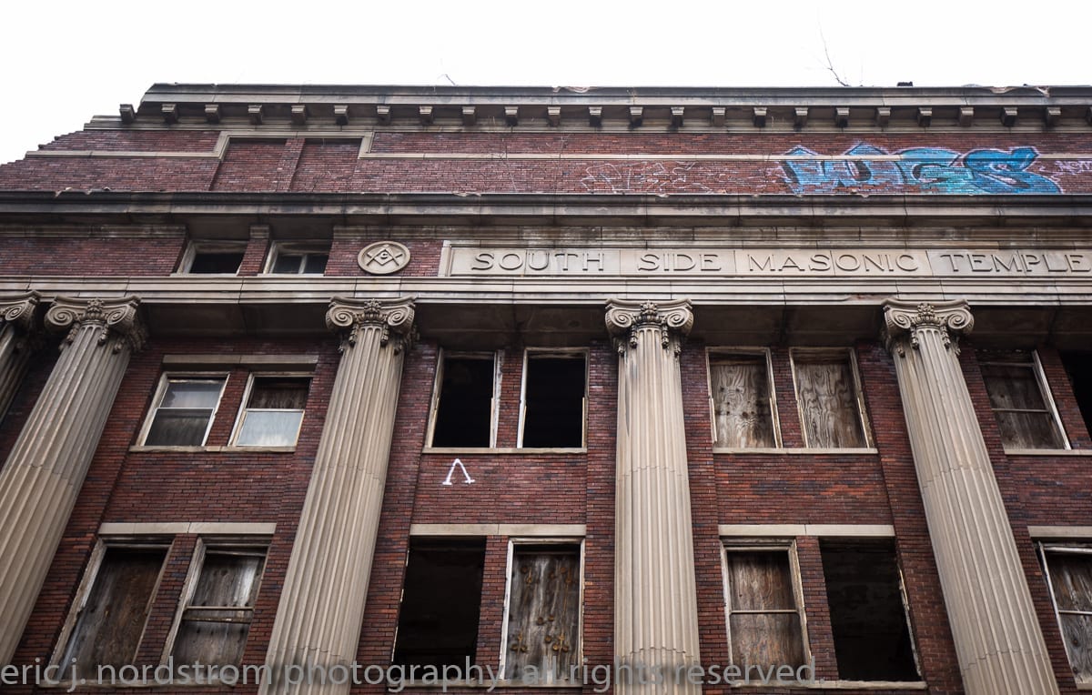 towering fluted limestone columns with ionic capitals augment the entrance and a centrally located stone header below the roofline announces the “south side masonic temple,” similar to the design of the logan square masonic temple.