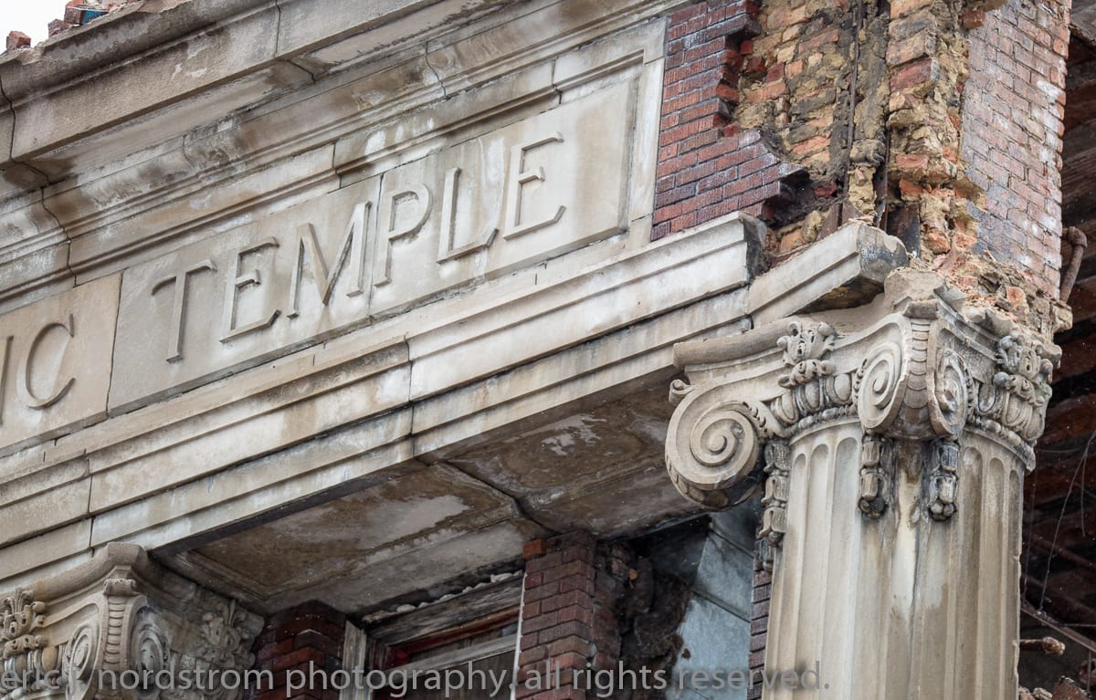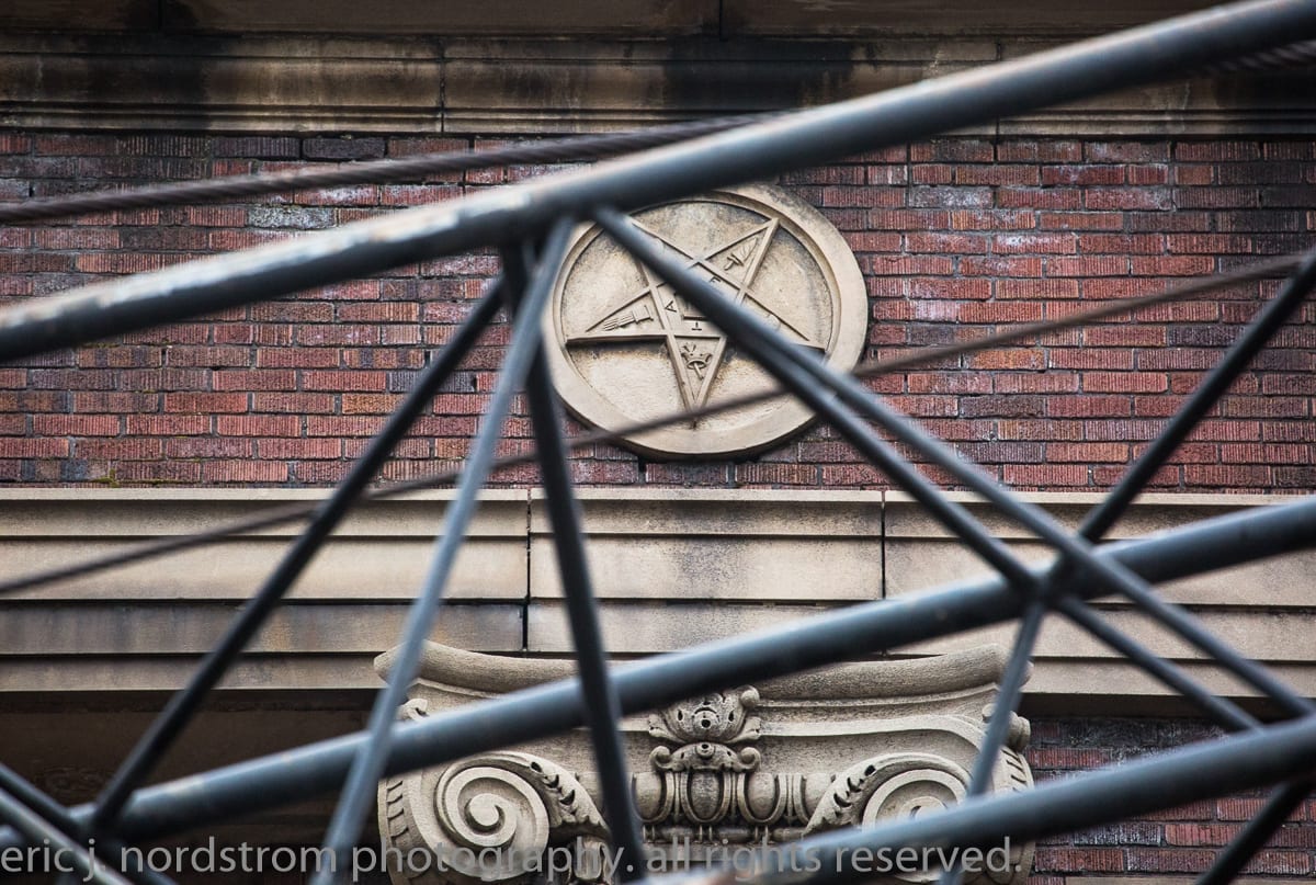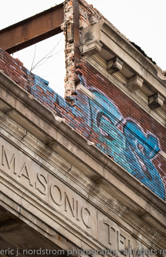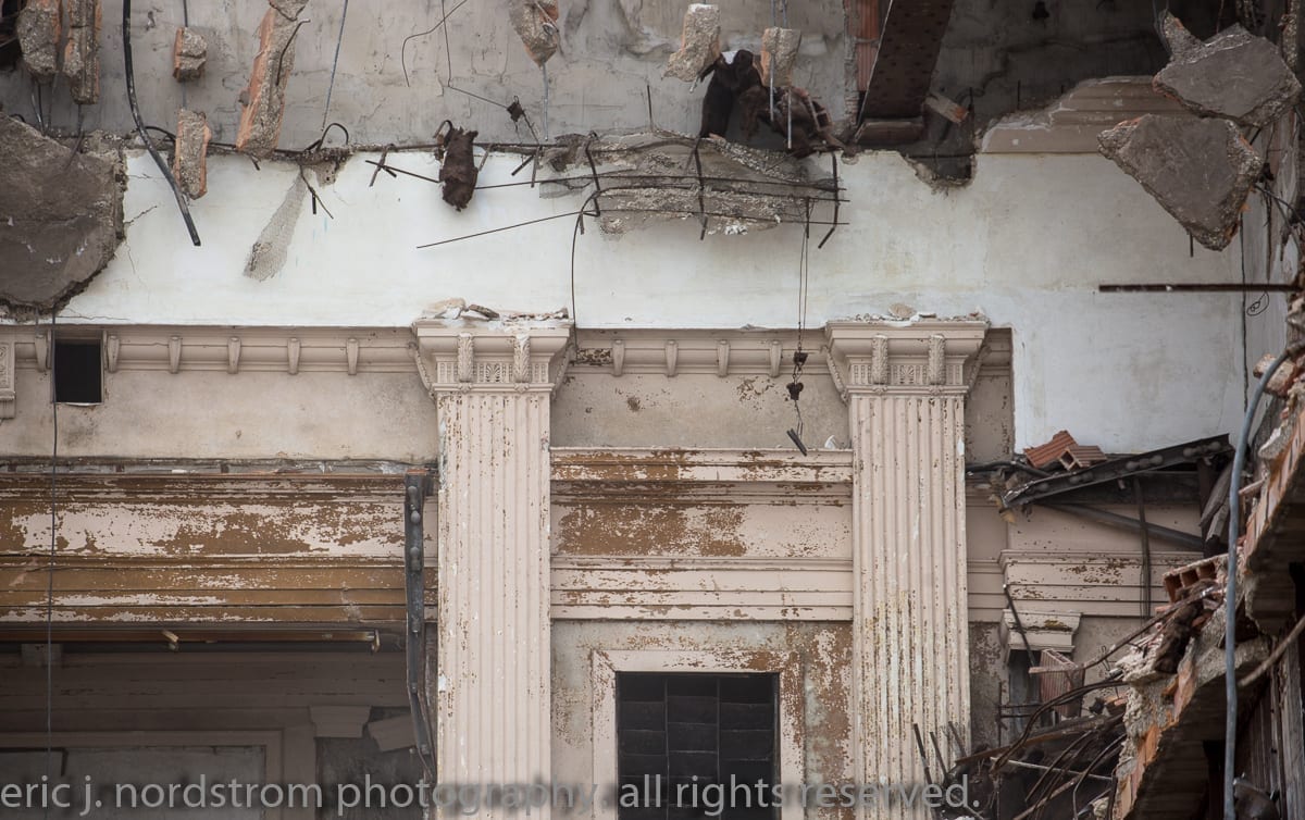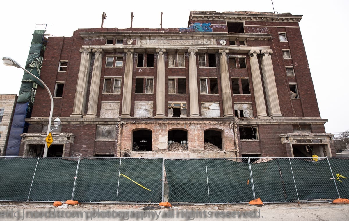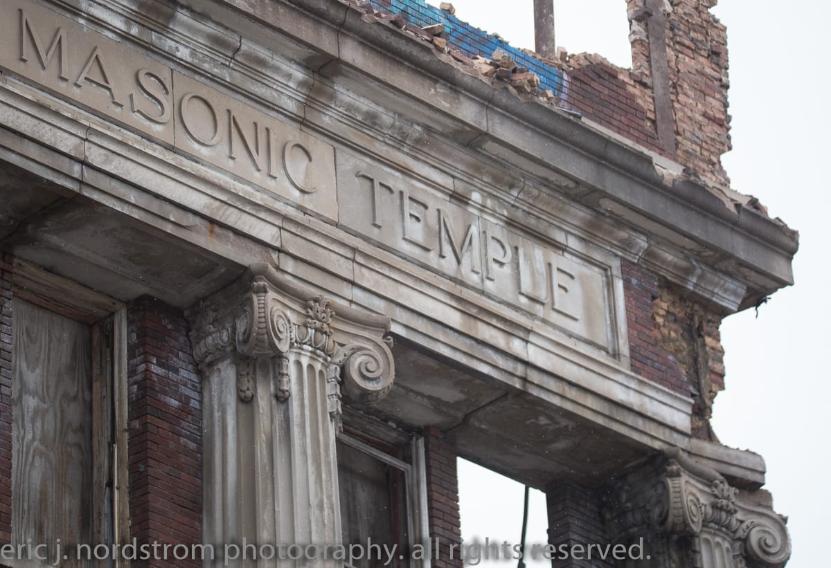 standing in front of this hulk of a building, the green demo fence line dwarfed by the sheer scale of this towering monument to the history of freemasonry in chicago, I felt overwhelmed by the task at hand.  i wondered how it was possible that despite a collective interest and acknowledgement of this building’s significance, i was the only one here to document its death.