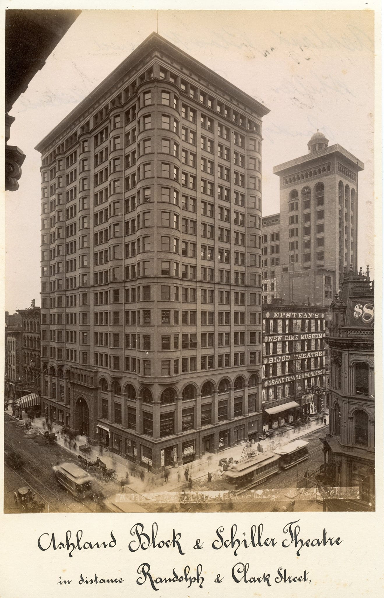 original james taylor mounted albumen print of burnham and root’s 16-story terra cotta-clad ashland block, with adler and sullivan’s schiller theater to the east. the ashland block was destroyed in 1949 and replaced by a greyhound bus station. schiller or garrick (1892) was demolished for a parking garage in 1961.