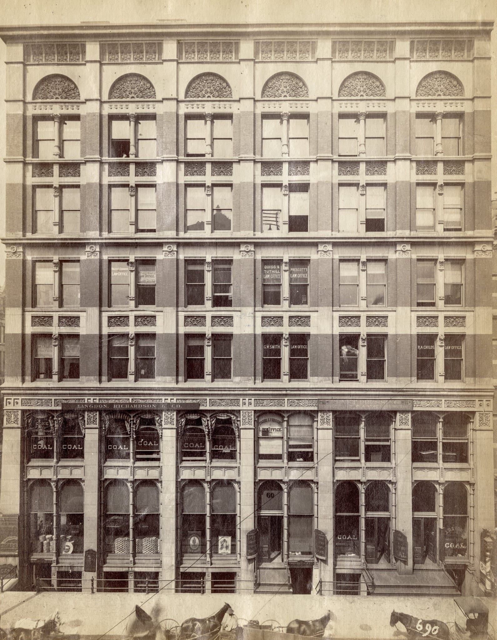 albert levy albumen print of the 6-story borden block office building shortly after it was completed in 1881 by adler & co., and louis h. sullivan.