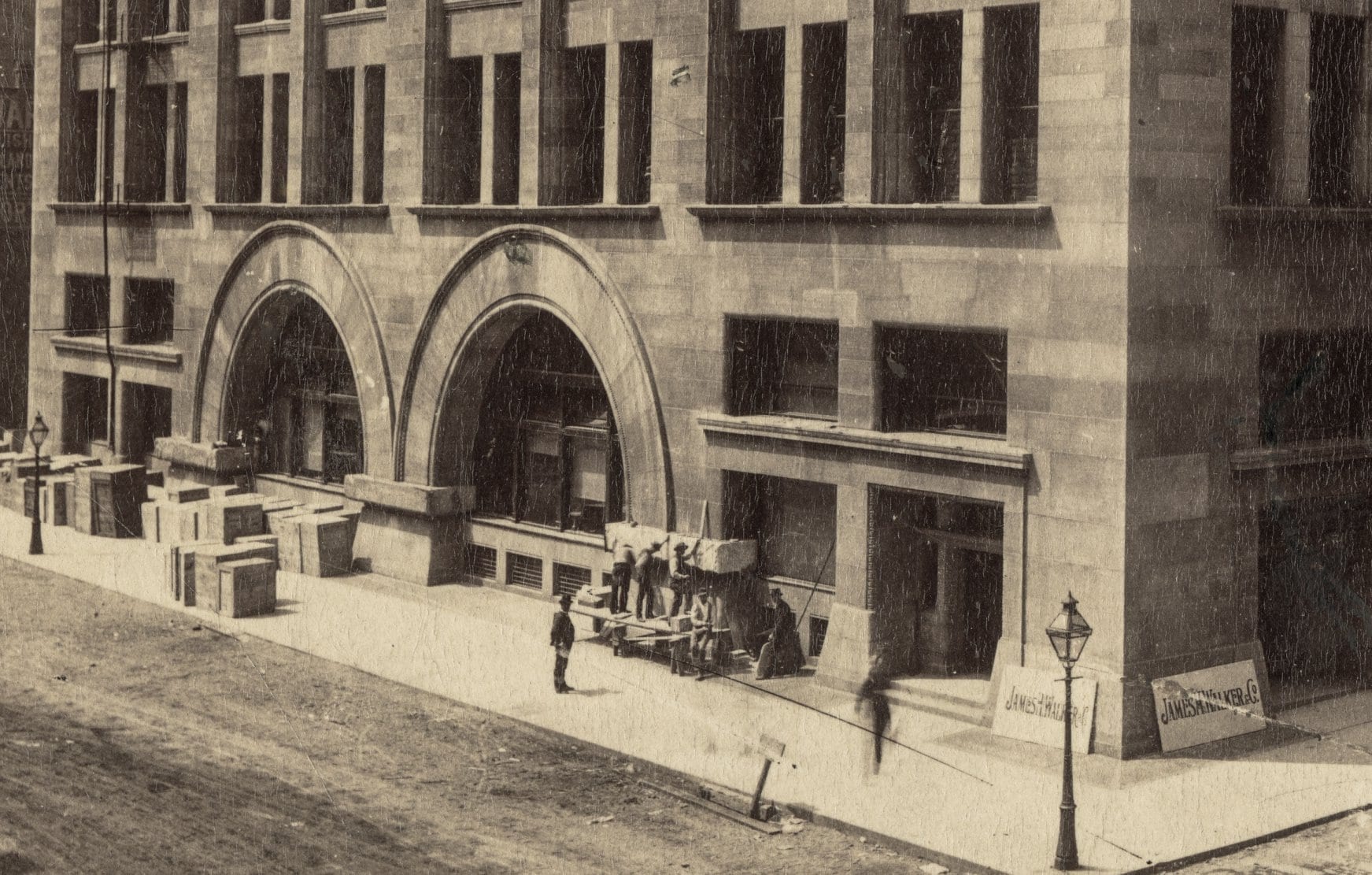 james w. taylor albumen of walker warehouse taken shortly before the building was completed in 1889. note the stonemasons carving the bedford limestone impost blocks onsite.