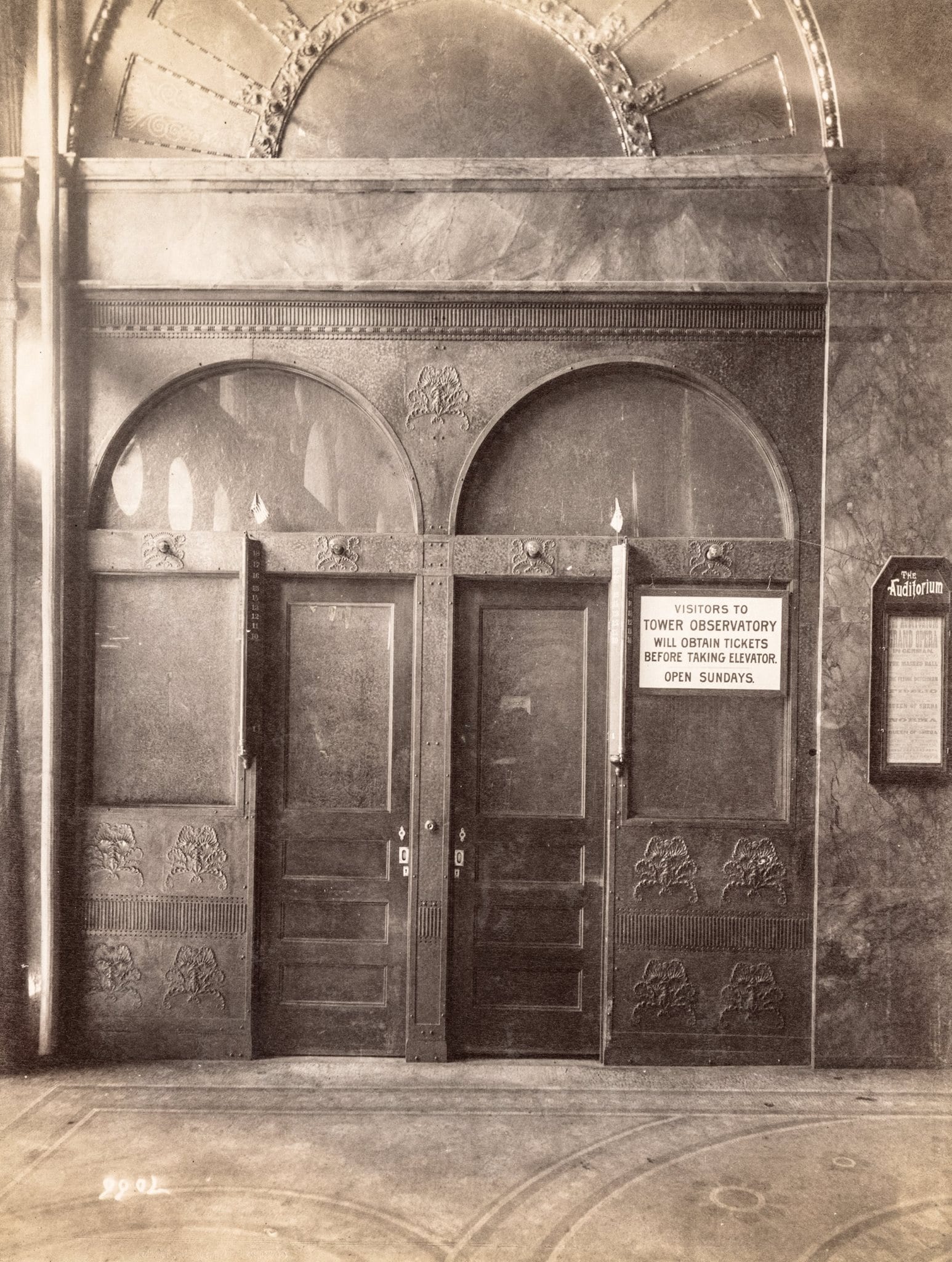a large set of albumen prints were made by photographer james w. taylor shortly after adler and sullivan’s auditorium building (1889) was completed, including images of the exterior, hotel, and theater. there were only a few i’ve never seen before, including this albumen print of adler and sullivan’s auditorium building elevator doors and surround leading to the tower’s 18th floor observatory.