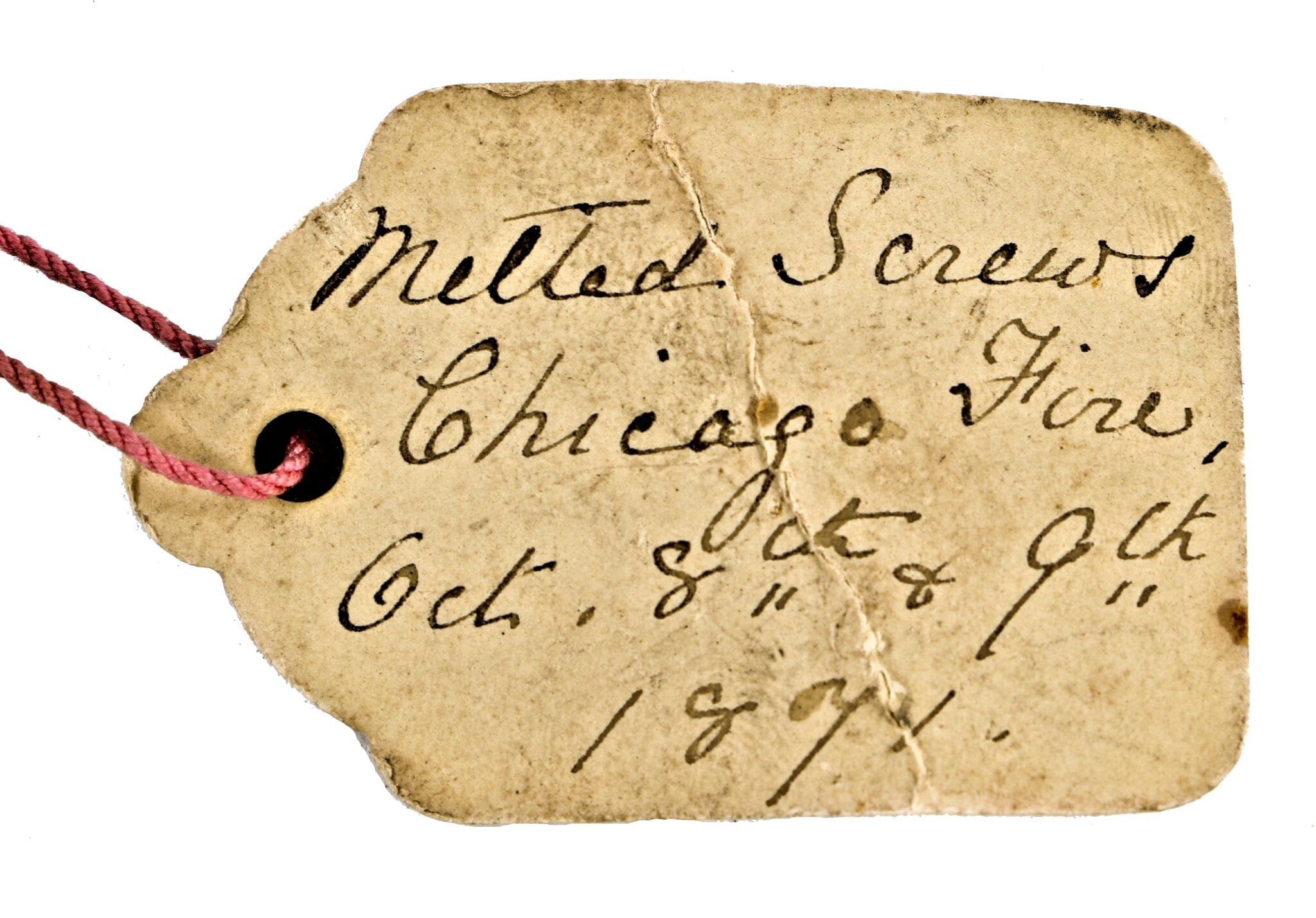 earlier this afternoon i received a small package containing a historically important relic or “souvenir”: a pile of melted or fused threaded screws found in the “burnt district” shortly after the great chicago fire was extinguished in 1871. the screws were likely housed in a box found in a hardware store, house or some other commercial building downtown. according to an informational tag containing comments hand-written in fountain pen, the unique artifact is identified as “melted screws chicago fire, oct. 8th & 9th, 1871.” the backside reads “picked up by j.h. gay in the burnt-district.”