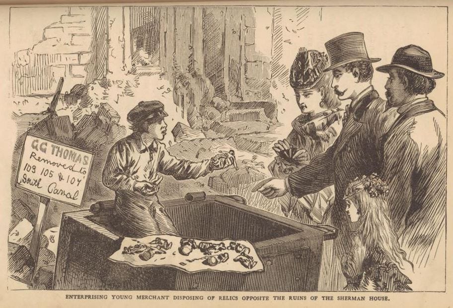 in fact, some people looking to earn a fast buck took advantage of this horrific calamity by setting up makeshift stands to sell artifacts as souvenirs to chicagoans and tourists alike.