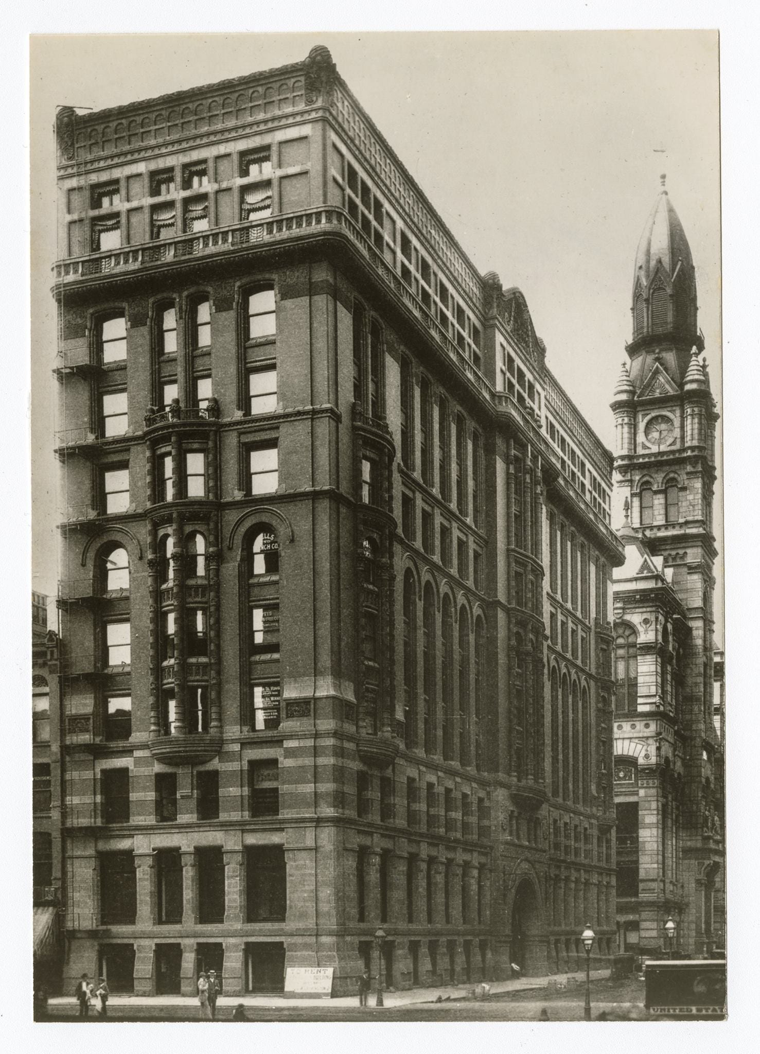 the early albumen print was taken around the time it was completed in 1887, with old board of trade building in background. the image first appeared in inland architect and i suspect james talyor was the photographer.