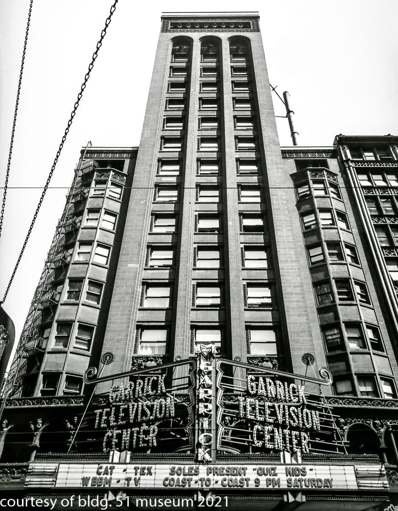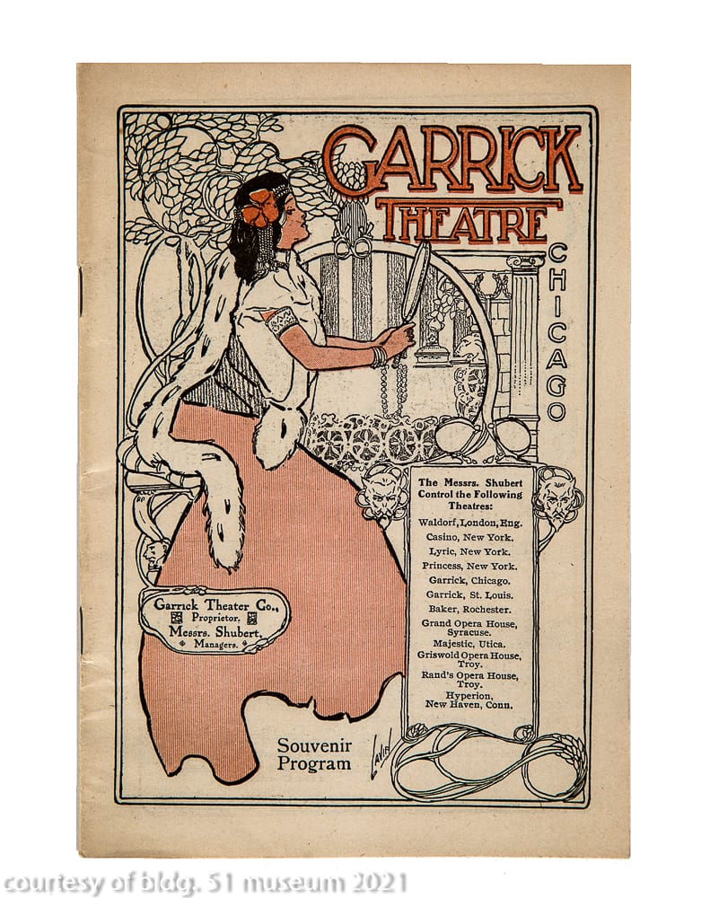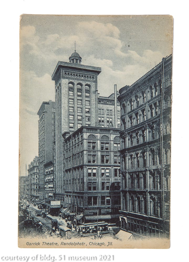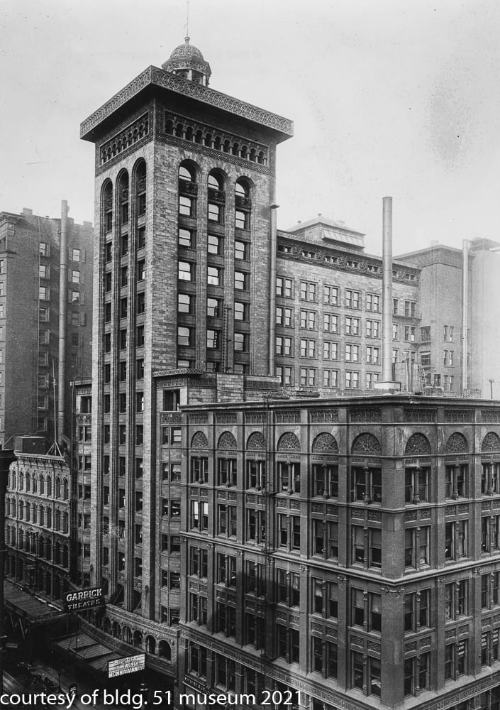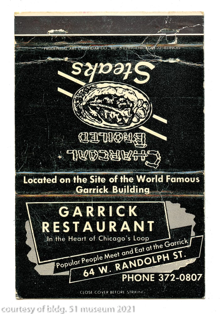the parking garage that replaced it incorporated a single original four-piece buff-colored terra cotta assembly (the schiller building’s terra cotta was executed by the northwestern terra cotta company) known as the “geometric flower” that was likely designed by chief draftsman, frank lloyd wright. the panel was originally located on the building’s tower beneath the projecting cornice and surrounding the four-sided arcade punctuated with deep relief terra cotta busts of germanic figures. the parking lot, which included the garrick restaurant (see matchbook covers) at street level was demolished in the 1990s. interestingly, the majority of the schiller building’s fifty-foot oak wood tapered foundation piles (nearly 700 piles were pounded down to hardpan to support the 17-story structure), remain in place and contributed to supporting the parking garage and likely the existing goodman theater.