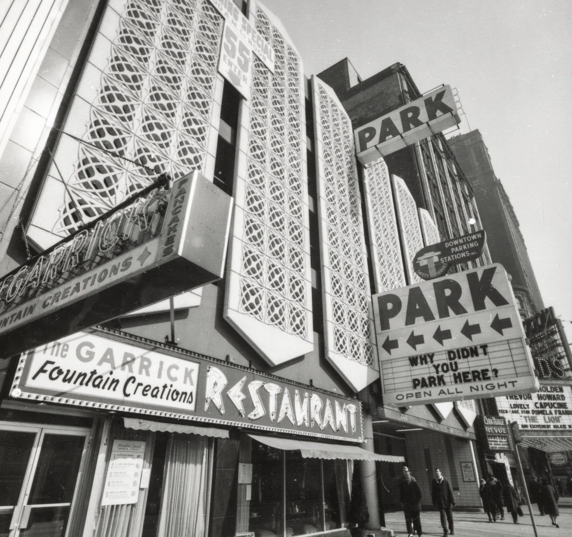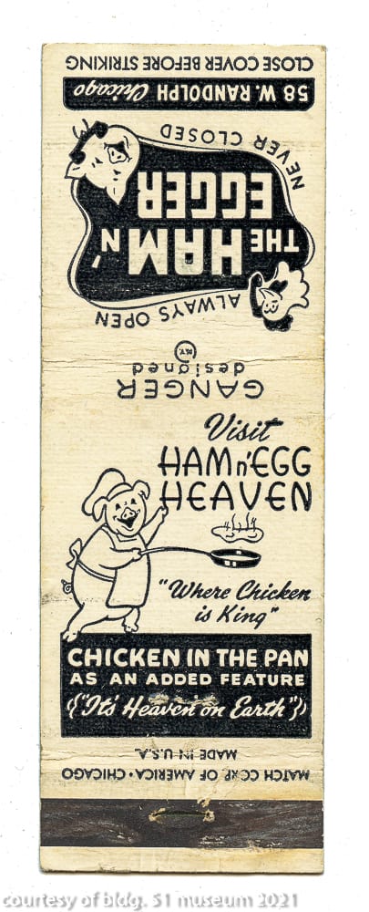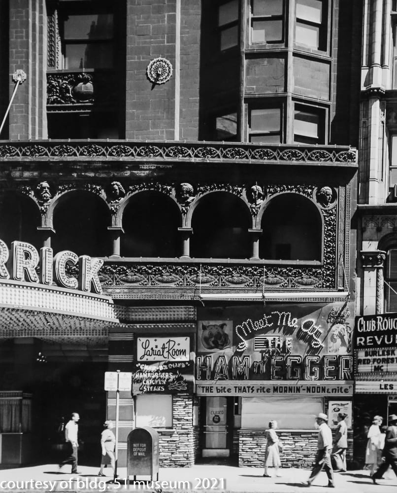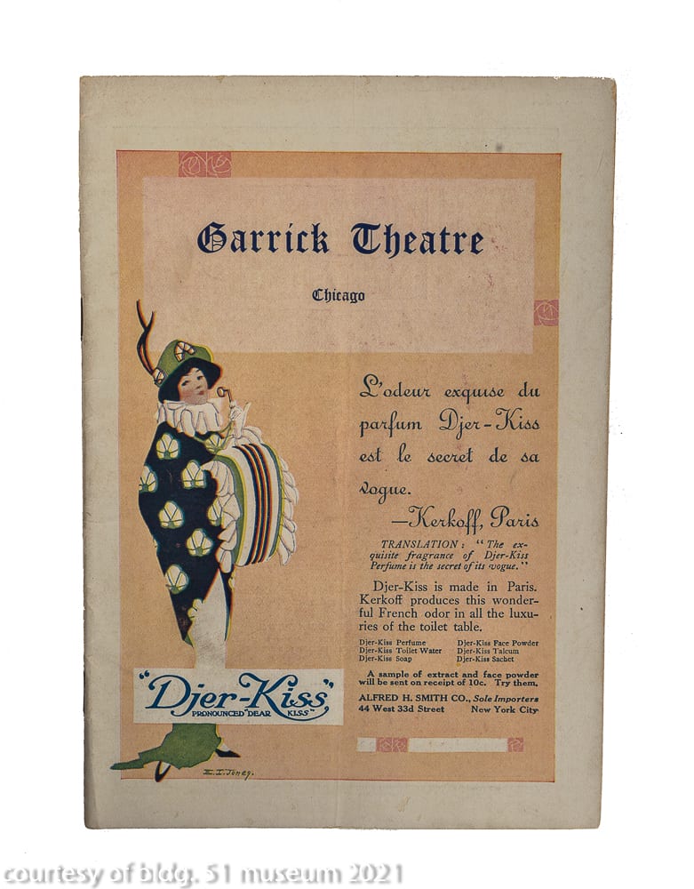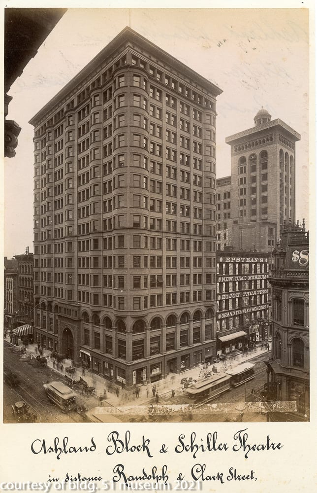 the parking garage that replaced it incorporated a single original four-piece buff-colored terra cotta assembly (the schiller building’s terra cotta was executed by the northwestern terra cotta company) known as the “geometric flower” that was likely designed by chief draftsman, frank lloyd wright. the panel was originally located on the building’s tower beneath the projecting cornice and surrounding the four-sided arcade punctuated with deep relief terra cotta busts of germanic figures. the parking lot, which included the garrick restaurant (see matchbook covers) at street level was demolished in the 1990s. interestingly, the majority of the schiller building’s fifty-foot oak wood tapered foundation piles (nearly 700 piles were pounded down to hardpan to support the 17-story structure), remain in place and contributed to supporting the parking garage and likely the existing goodman theater.