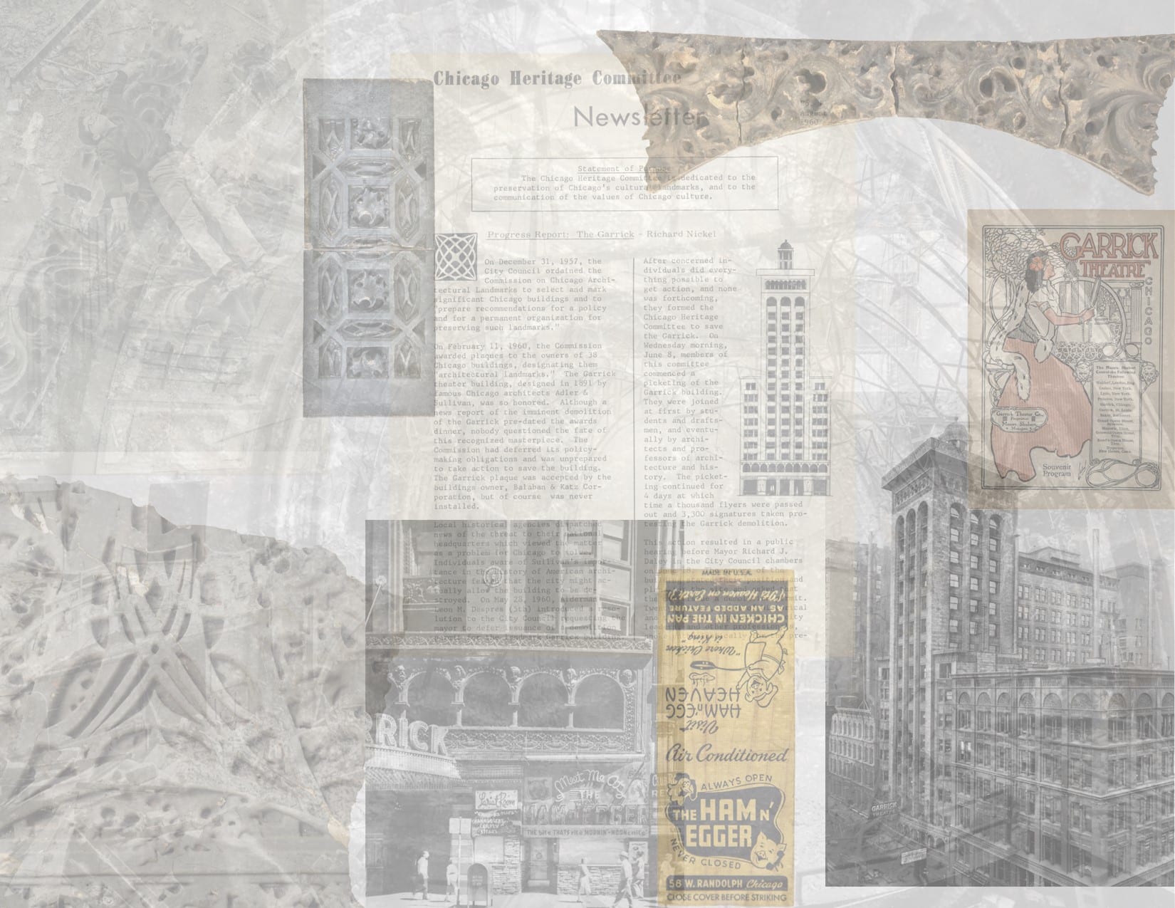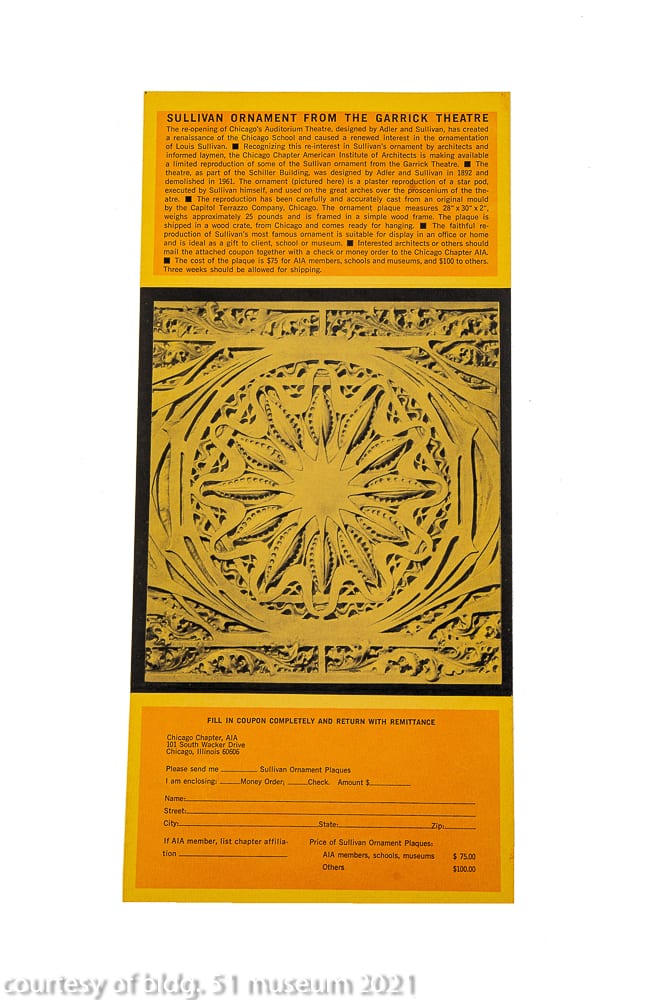 the following images in the gallery below offer a glimpse at any and all artifacts and ephemera pertaining to adler and sullivan’s schiller building (later known as dearborn and garrick theater) completed in 1892. the artifacts, including interior and exterior architectural ornament (e.g., terra cotta, cast plaster, mosaic fragments, etc.) was salvaged by richard nickel, john vinci, and david norris during the building’s senseless demolition in 1961.