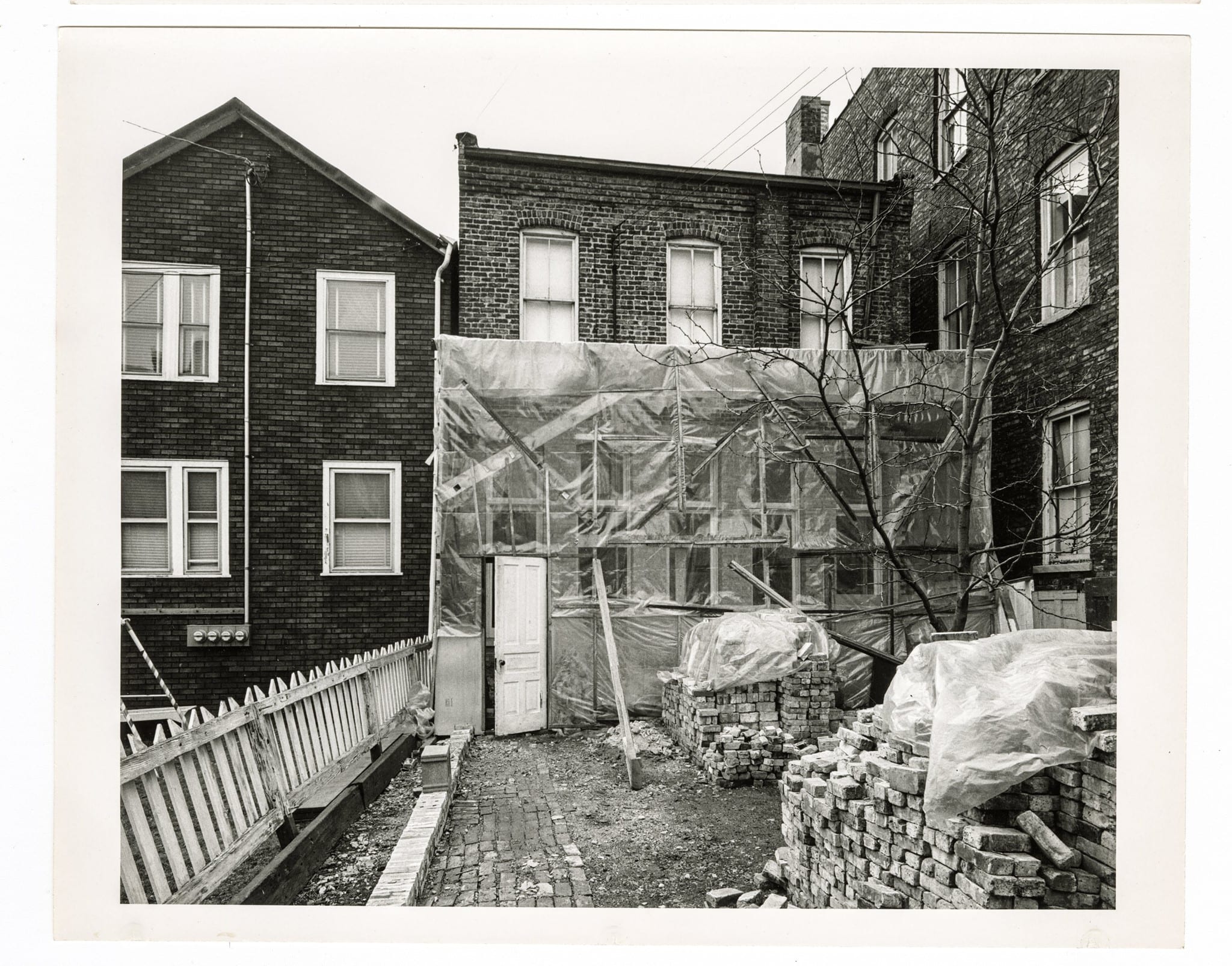 sadly, the facade and a few feet of the original two-story building remain standing. most of it was demolished with the space later integrated into a neighboring home.