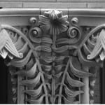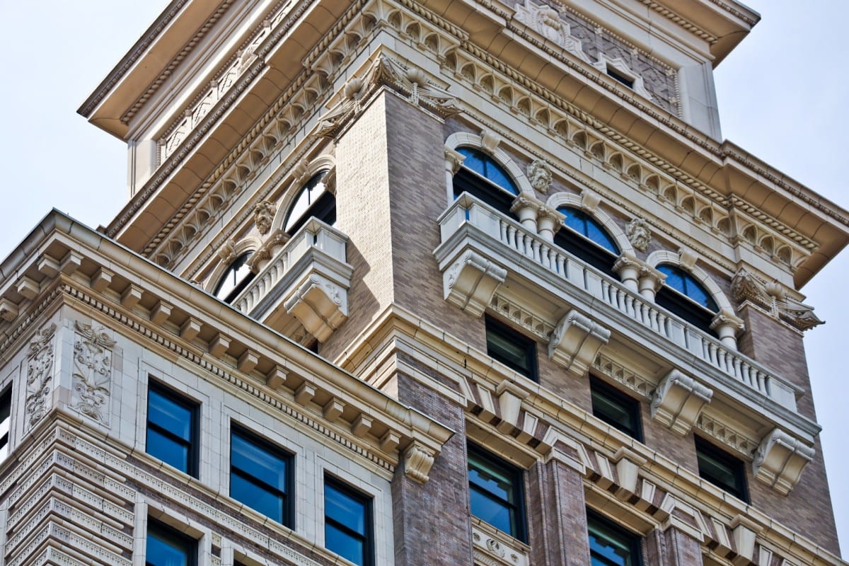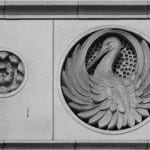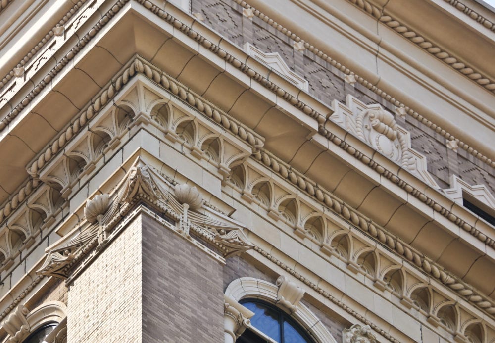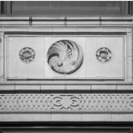 the use of terra cotta permitted a range of ornamentation which would not have been possible otherwise, and the architect improved upon this opportunity by enriching the structure with modeled terra-cotta by the best artists. some excellent marble carvings are also in evidence. the motif for much of the ornamentation was taken from the indigenous plants, birds, fishes, and such. the fish panels in marble represent pike, salmon, muskellonge and trout; of birds, there are pheasants, swallows and cranes. the bronze floor panels represent corn, wheat, rye, millet and all the grains. the tower has general characteristics of the italian renaissance. the superstructure combines all the essentials of modern architectural style, skillfully worked out. the main entrance is through a marble portico, pedimented, in which is a marble fronton (modeled by ph. martiny, of new york) consisting of two lions and two youths on each side of a large shield.
