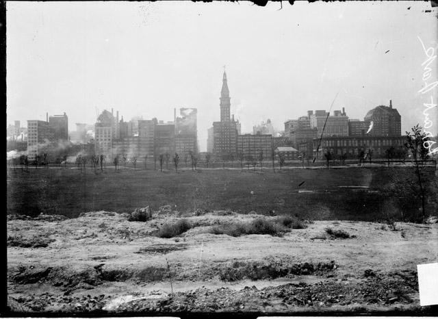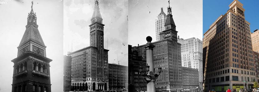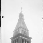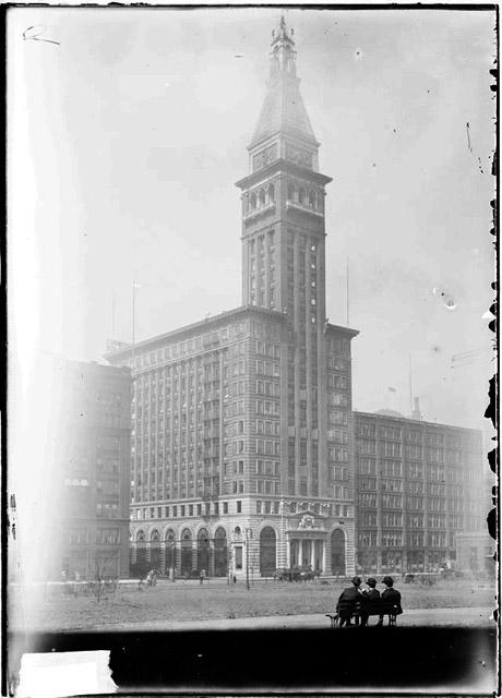 an interesting feature of the building was the figure of progress at the top of the tower, acting as a weather vane, and which was once illuminated at night by four powerful multiplex reflectors placed at the four corners of the tower under the figure, flashing brilliant rays of light on the polished copper of which the figure was constructed. the shafts of light from the reflectors were properly trained by means of hinge and socket hangings. these powerful reflectors were furnished by the w.r. garton company, chicago, ills.