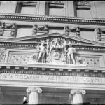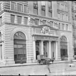 of exceptional merit are the bronze floor plates in the front entrance, which were designed by h. g. m. garden, and represent the different products of the farm, as wheat, corn, oats, etc.; also the large floor plate representing “commerce.” we note also the other conspicuous bronze-work of the front entrance, including the solid bronze folding gates and the solid bronze sign over the entrance. here was also furnished eleven bronze floor plates, the ornamental solid bronze kick plates, and the bronze lining of the revolving door entrances; also the ornamental iron stairs, the fire-escapes, which are truly architectural in design and workmanship, the ornamental elevator enclosures for two stacks of passenger elevators, the ornamental grills and bronze wickets for office partition, all the wire partitions, the iron-work for box elevators, the iron railing on the tower. the patent horizontal folding gates, and the meeker elevator doors for all freight elevators. all of this work called forth unstinted praise from such of the architectural profession as have seen it, and it is enough to say that it was executed in the best style of this well-known company.