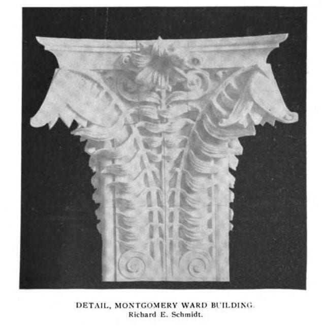 the montgomery ward & co. building is an excellent example of the use of terra-cotta for an exterior finish. the terra-cotta used in this instance was the cream dull enameled in gray speckled color. its effect on the eye is very pleasing. it is not perfectly smooth and shiny, but is entirely impervious to moisture, can be washed down and will be as clean as when it left the kiln, thus preserving the color in its original integrity. there is a very gratifying tendency among chicago businessmen at the turn of the century toward light colors. somber browns and dirty grays are destined to be abandoned in favor of enameled terra-cotta in light colors, and a more cheerful aspect of the city will be the result.