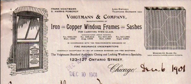 as previously stated, the floors were the only wood in the building. even the window casings are of metal, as well as the frames, which might seem be a useless precaution on sides of the building not directly exposed to fire danger, but the general plan of absolute fireproofing called for the best of everything in this line and the best was provided. the windows are of plate glass set in hollow metallic frames, and this plan of construction has been used throughout in the most intelligent and efficient manner to insure positive protection from the spread of fire. it will be readily seen that this feature may become at any time of the highest importance if a fire should break out in merchandise stored at a point above the reach of the street hose, and in any case it adds immensely to the value and security of the building. the standard construction of voigtmann automatic closing and locking windows has been used. the iron frames were set in the masonry while in process of erection, being held by a flange sunk to a depth of two inches in the brick and terra-cotta. they are dust and weather proof, and are affected only slightly by contraction and expansion. the feature of special interest in this connection is the use of iron in place of wood frames for the setting of the plate glass on street sides. this construction is well exemplified in the montgomery ward & co. building, where it has been applied with perfect success. this is a very valuable adjunct to messrs. voigtmann & co.’s regular business of metal frames and sash for carrying wire glass, and has proved to be entirely satisfactory. the incorporation of the geisey pivot into the metal frames and sash; which allows the window to be easily opened for ventilation and cleaning, was the final step in the elimination of all wood from exterior construction.
