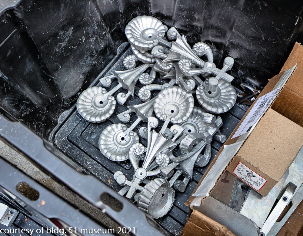 the recreated or recast pieces of ornament are comprised of aluminum and will likely receive an enameled finish based on color analysis of the pieces from our collections. more images and information when time permits.