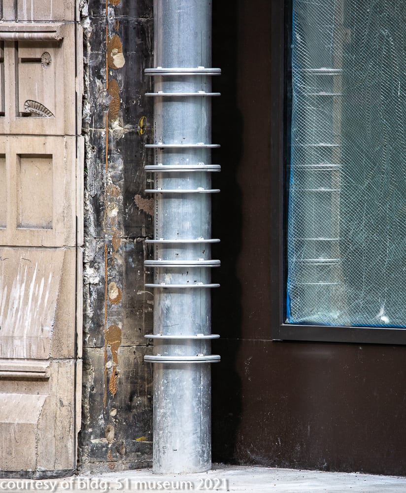 as previously mentioned, the rediscovered capitals were once part of the four original ornamental cast-iron columns that extended up from the sidewalk. complex structural alterations in 1955-56 led to removal of the columns, leaving only the capitals at the top. the recreated columns were executed using photographs taken by sullivan historian and architectural photographer richard nickel during the 1955 removal, as well as replications of screwed-on ornament he salvaged at the time aldis made the modifications. the recently uncovered column capitals were carefully removed to allow molds to be taken for the replication (these components have since been recast and installed and revealed in the images.