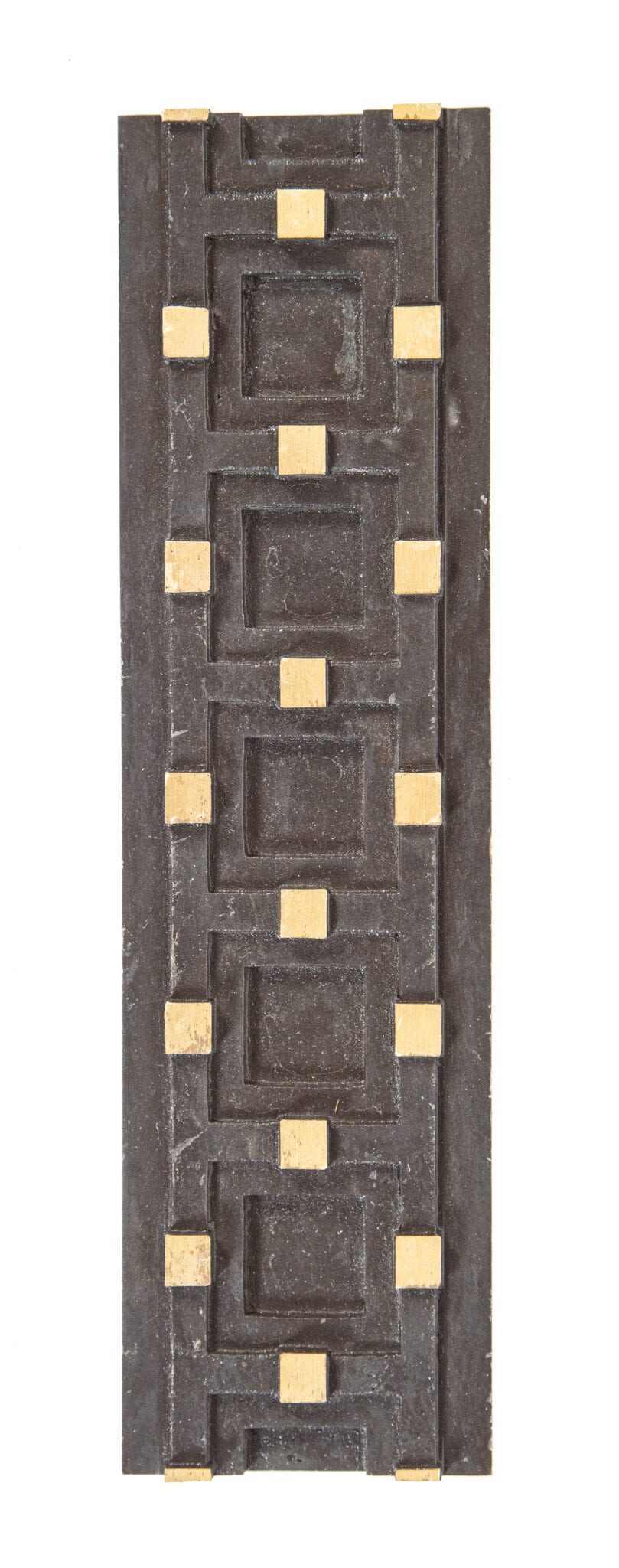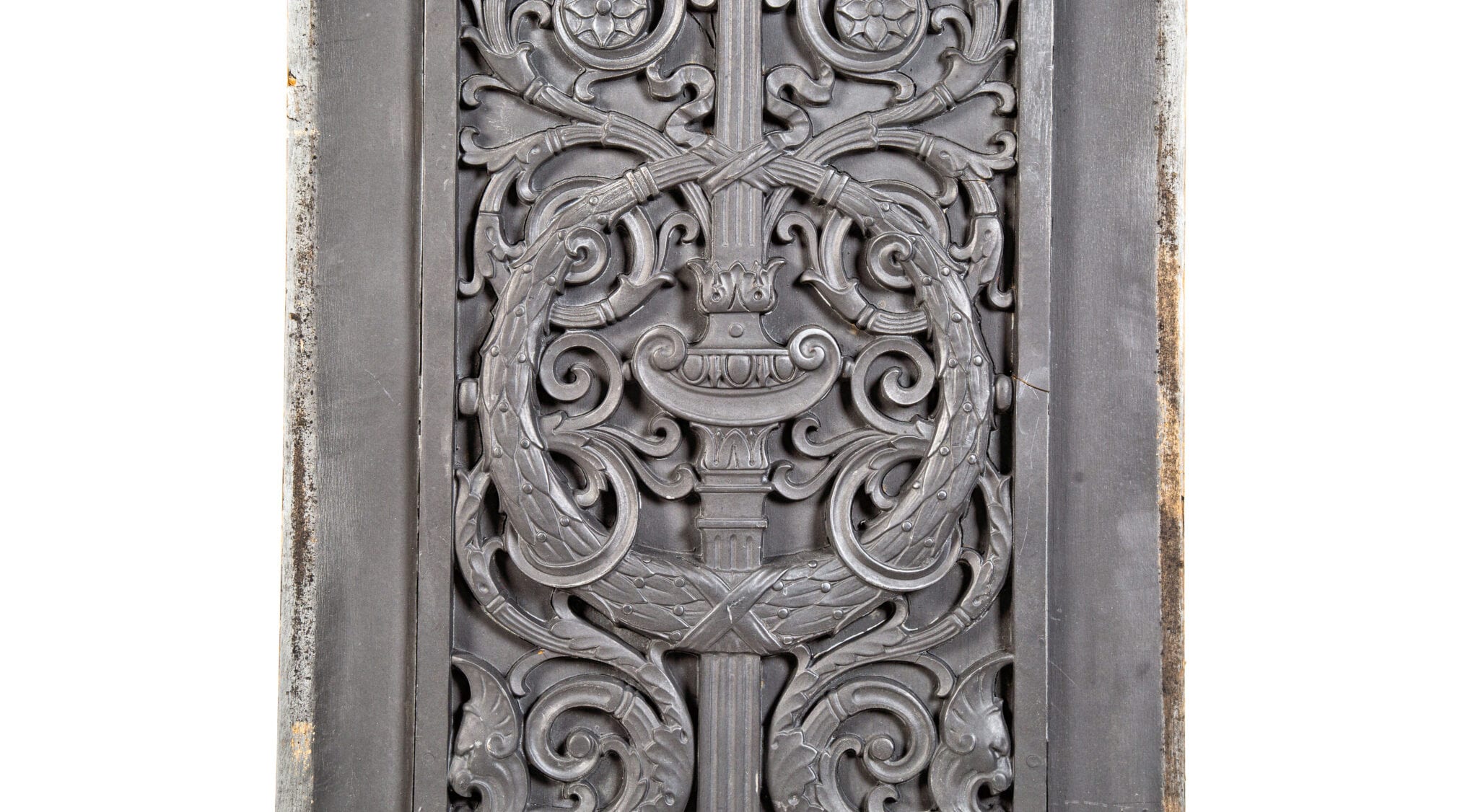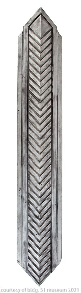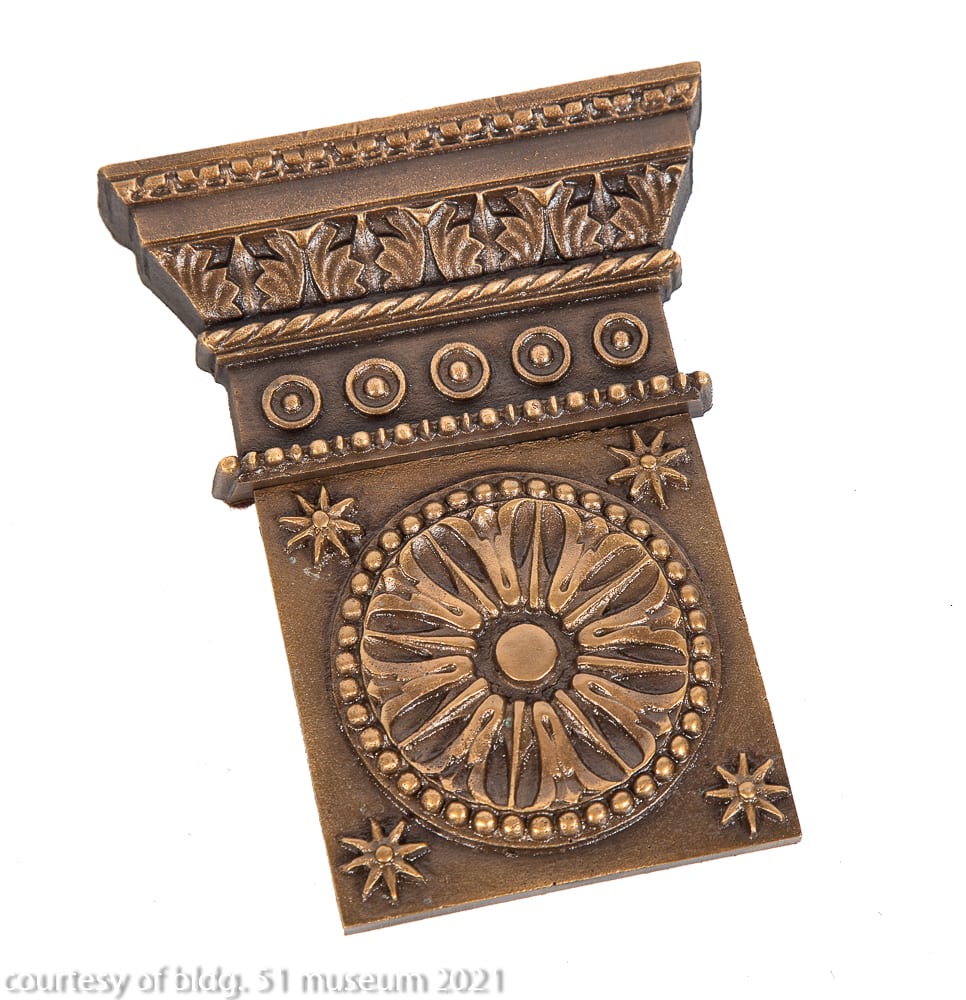 the assemblage is comprised of both interior and exterior metal (e.g., bronze, brass, aluminum, etc.) recast ornament sourced from numerous 19th and 20th century restored downtown chicago landmark buildings spanning several decades.