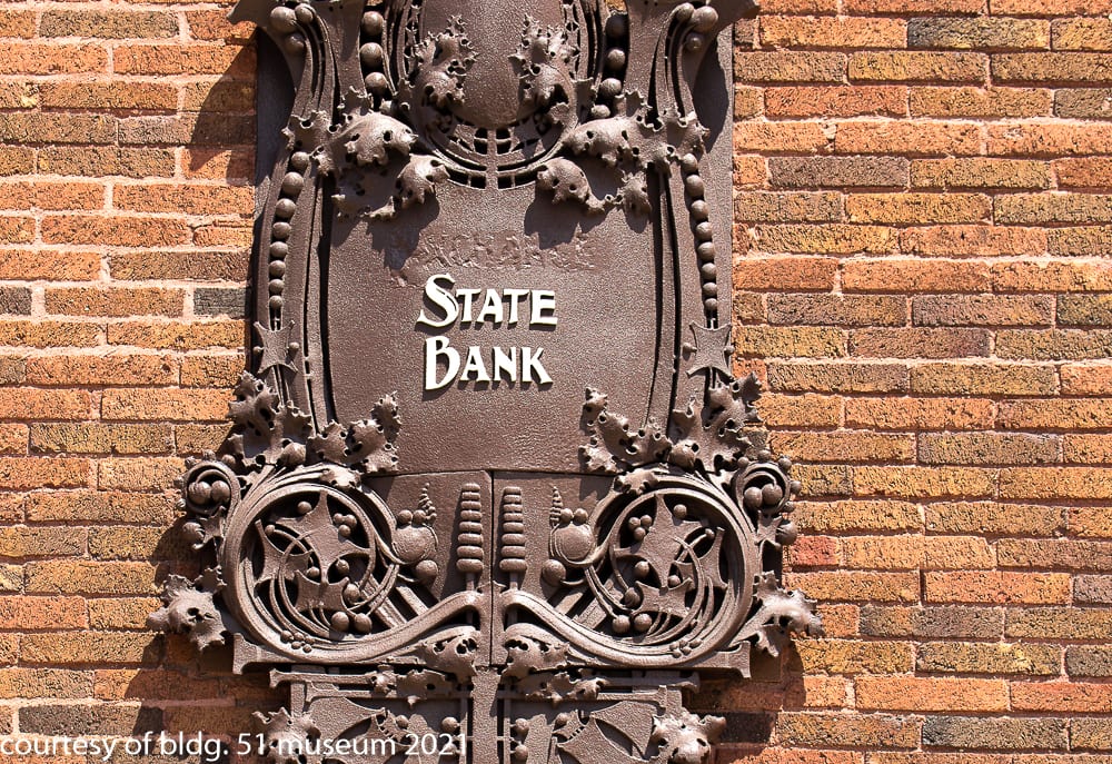 elmslie punctuated the dark red tapestry brick exterior with polychromatic sullivanesque terra cotta ornament (i.e., opposed panels above main entrance), oversized organic and energized cartouches bearing name of bank (unfortunately, a reckless name alteration/eradication left the centrally located portion of the panels visibly scarred), richly colored mosaic tile borders surrounding the polychromatic panels, a single delicate fret-sawn painted wood lunette above the arched entrance located above the side door, and leaded art glass windows.