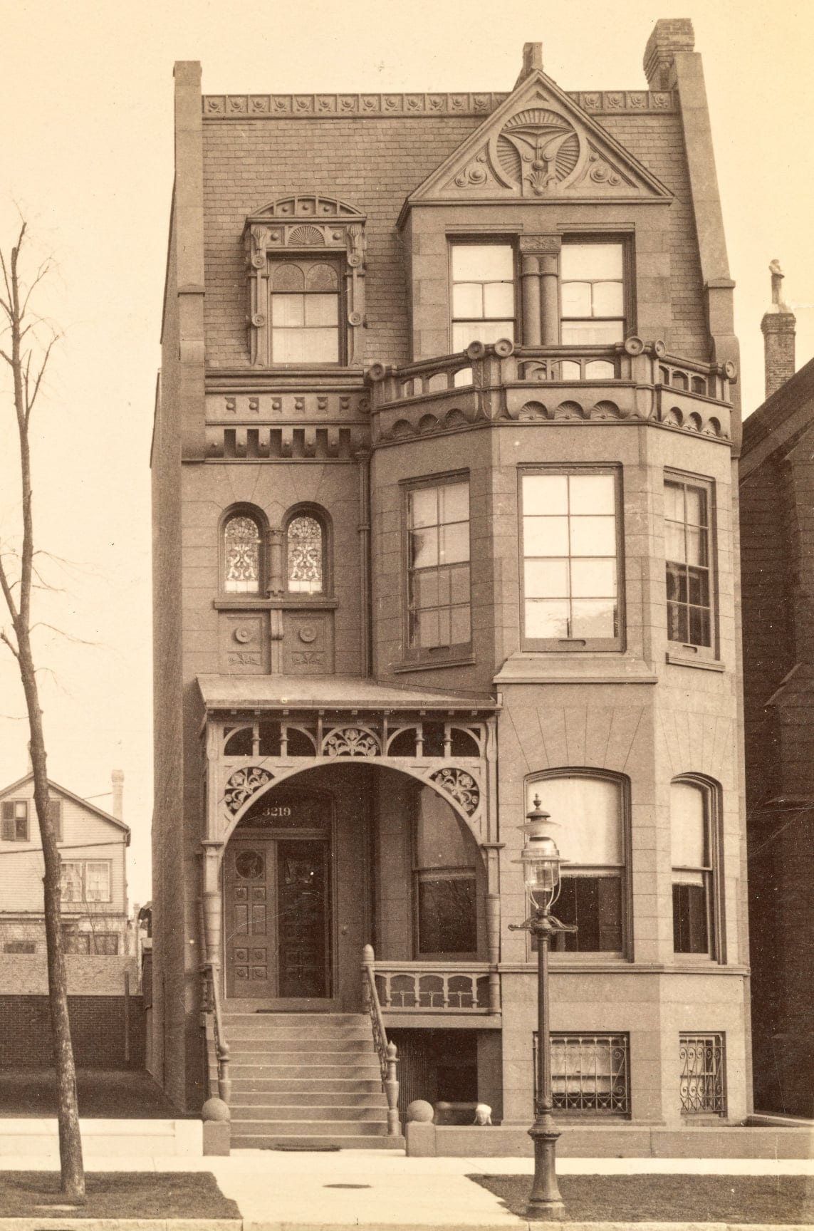 the non-extant frank house was commissioned by successful chicago businessman louis frank with dankmar adler & louis sullivan as architects. in 1884 the house was constructed at 3155 s. michigan avenue. the slim, three story structure was well adapted to maximize residential space while remaining within a conventional city plot of land. the mansion was crowned with galvanized stamped steel ornament. the facade featured a luxurious two-and-a-half-story projecting bay, elaborate portico with arched fretwork, art glass and ornamental cast iron exterior newel posts and window guards.