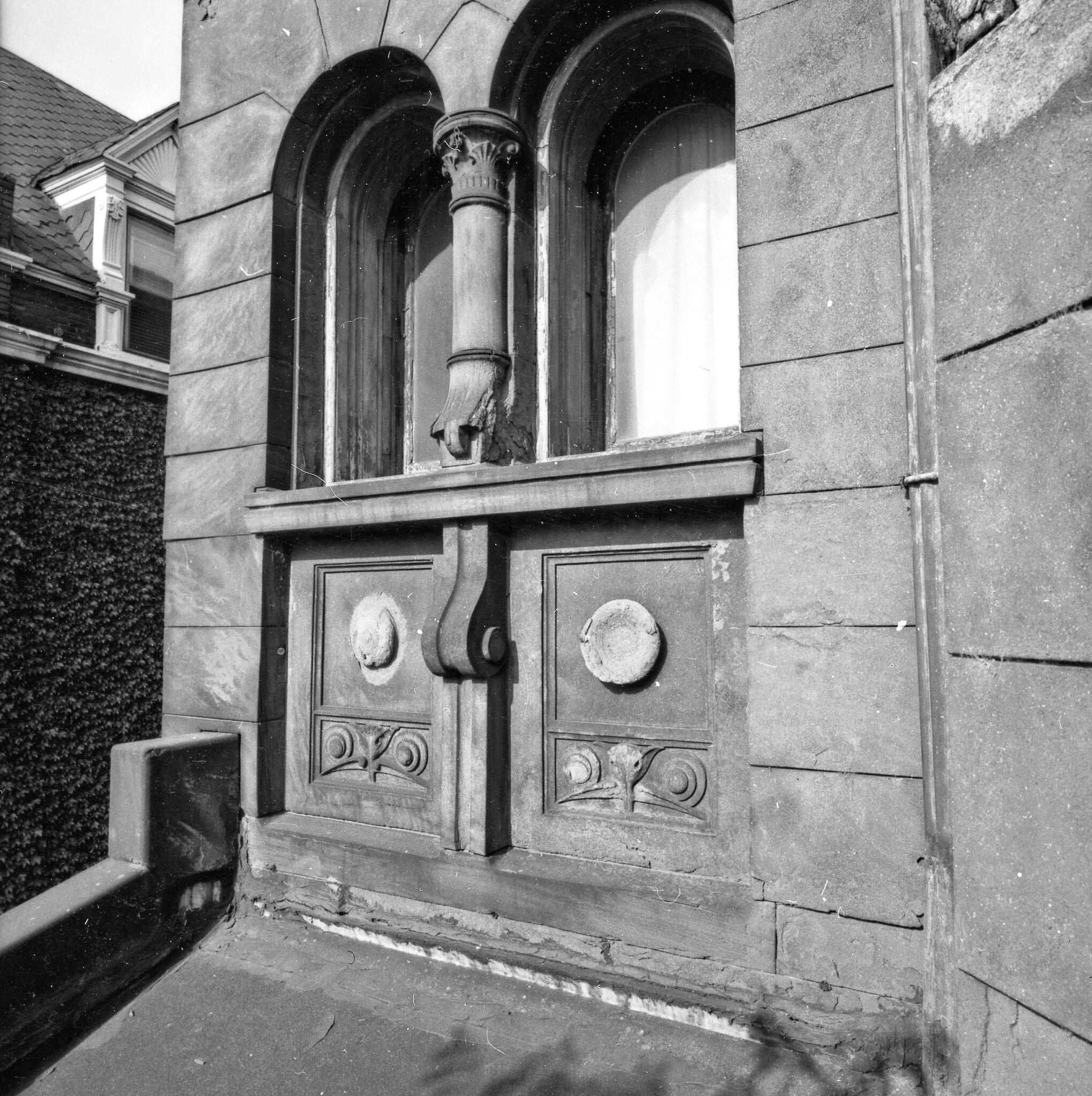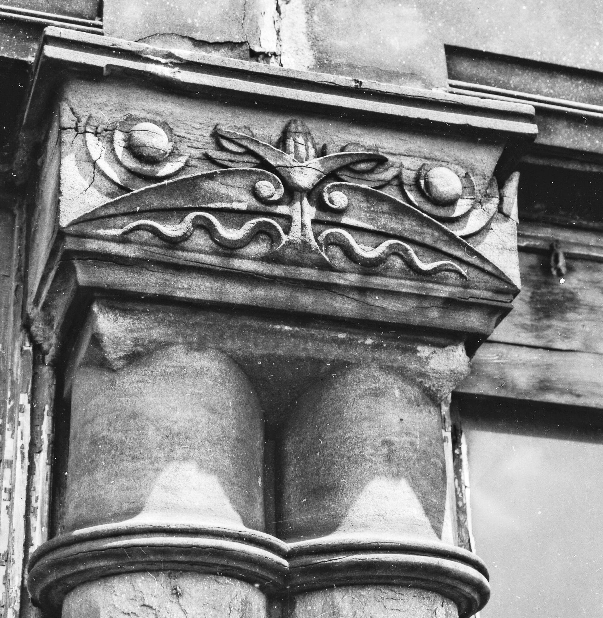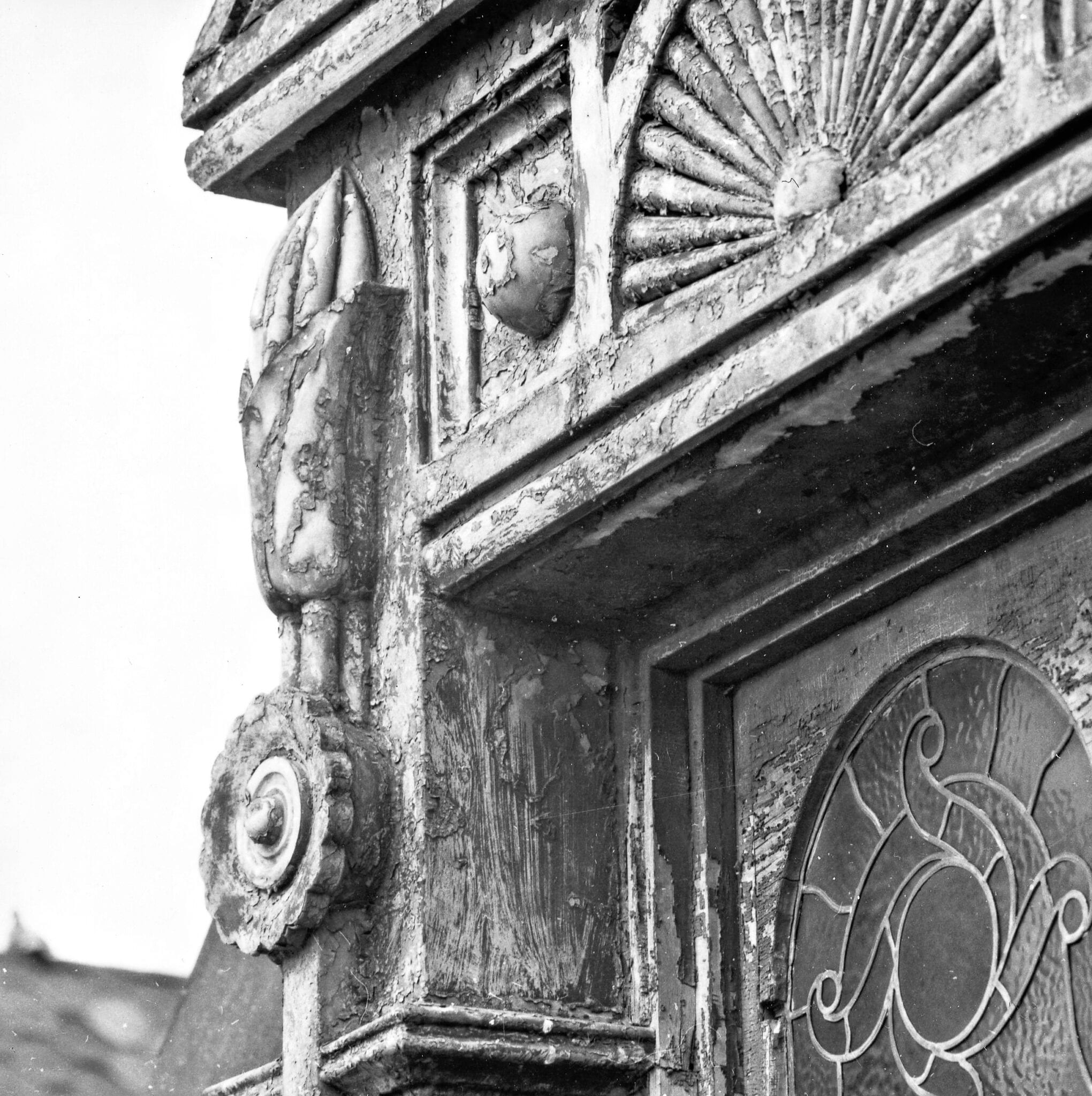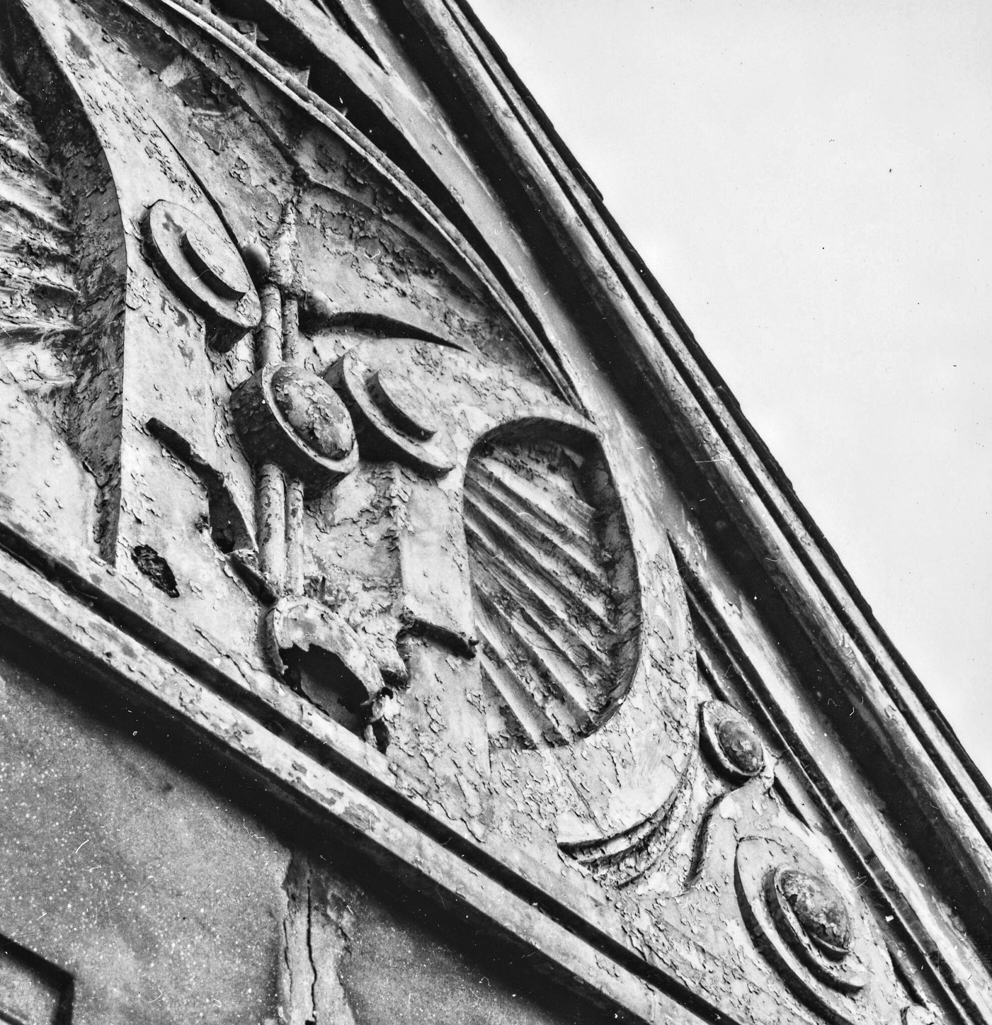 the plaster ornament was likely modeled by james legge, who executed the plaster work for adler & sullivan’s auditorium building (1889). interestingly, identical cast plaster escutcheons were found and salvaged in other adler and sullivan houses (dating to the 1880s) during demolition in the 1960s.