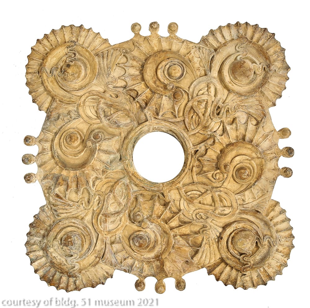the museum-quality cast plaster interior residential louis h. sullivan-designed ceiling medallion was one of several salvaged by richard nickel, david norris and bob furhoff in 1968. the medallion is a relic of the structure it belonged to, tying us to 19th century craftsmanship and the different iterations or occupants of 3155 s michigan. the frank house remnants find significance as a small token of the lineage of early salvage work in chicago.