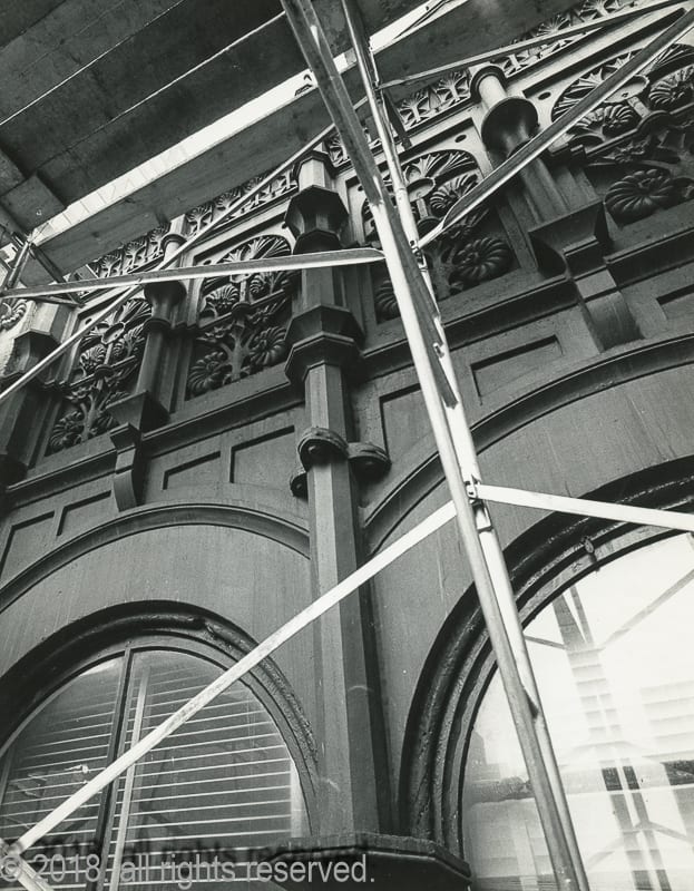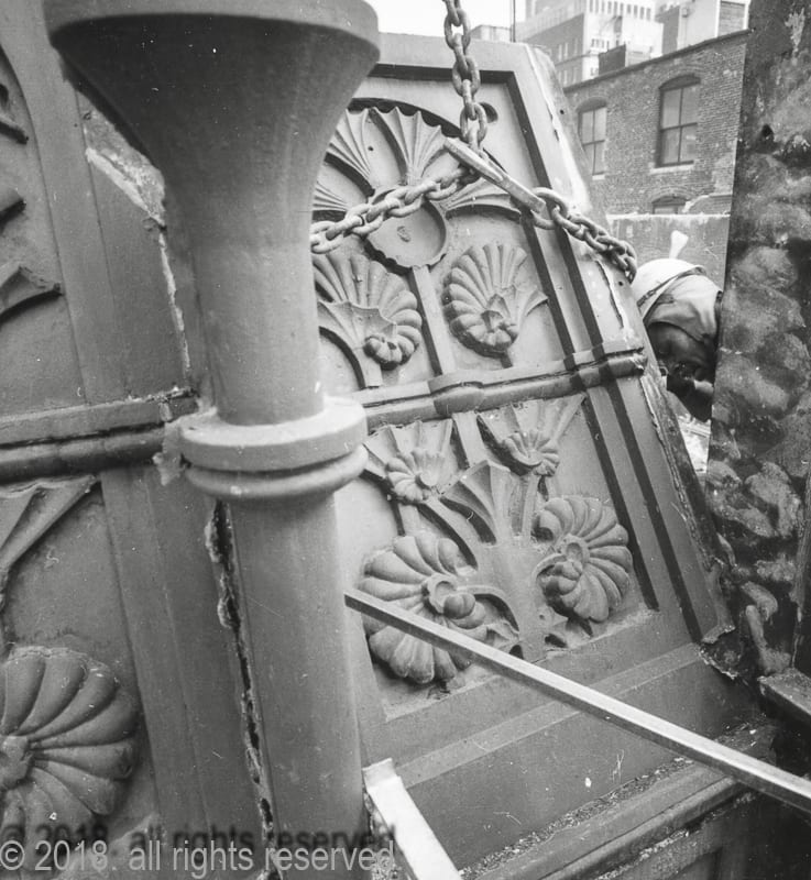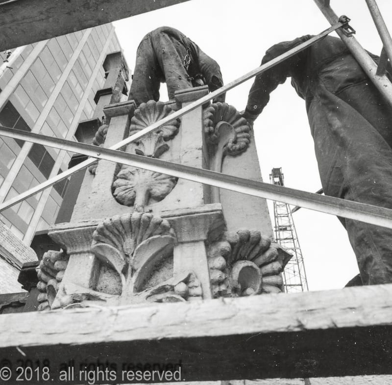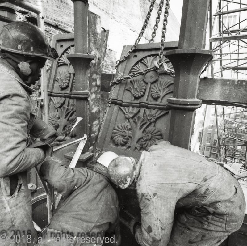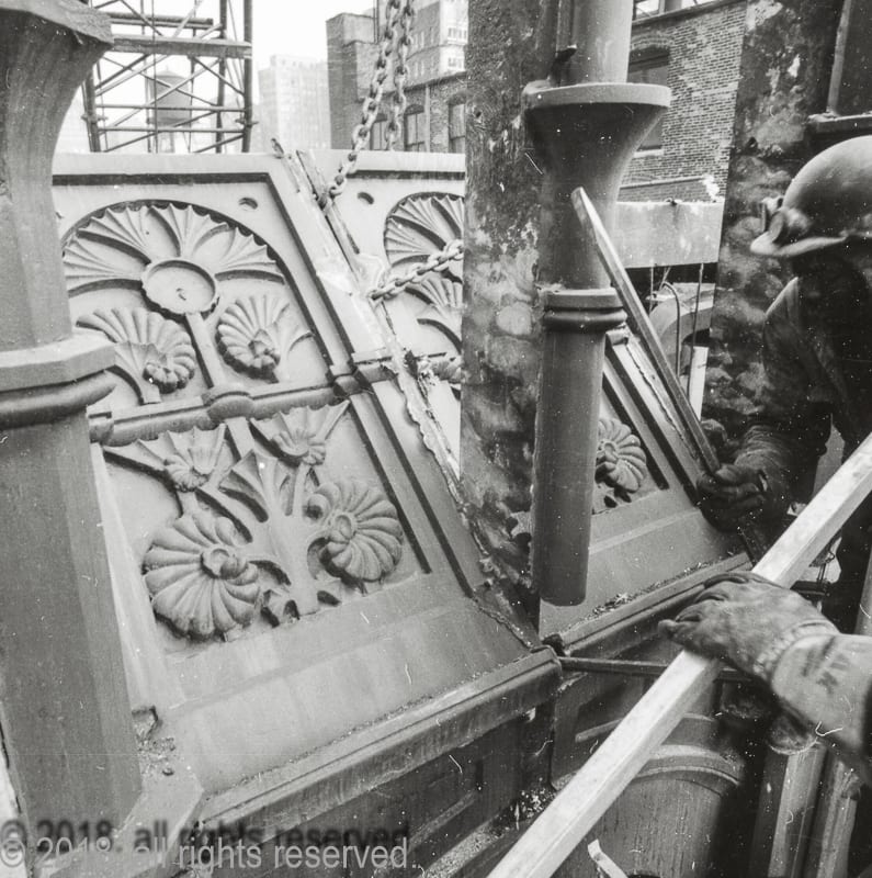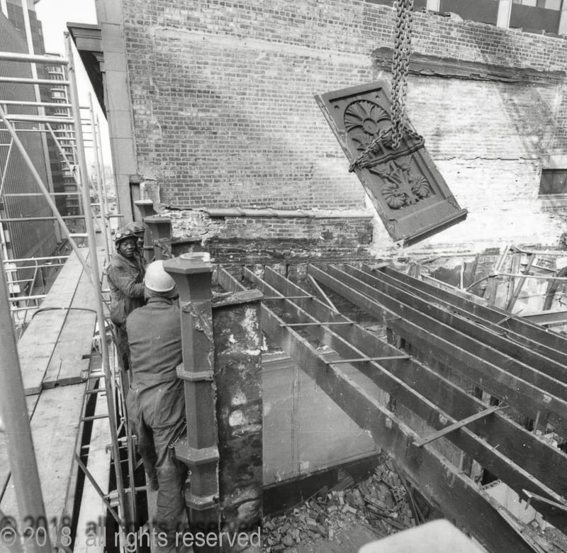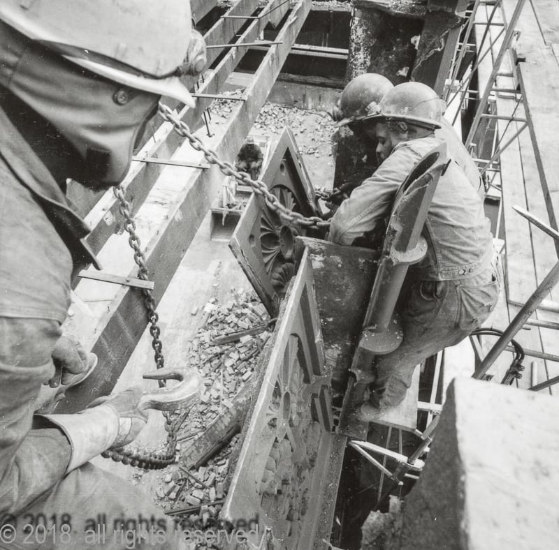 with unrestricted building access during demolition, nickel systematically documented the wreckers dismantle the limestone and cast iron cornice, including the removal of four panels he arranged to have saved for the art institute, edwardsville, and other institutions. the eight remaining iron panels and cornice sections were scrapped.