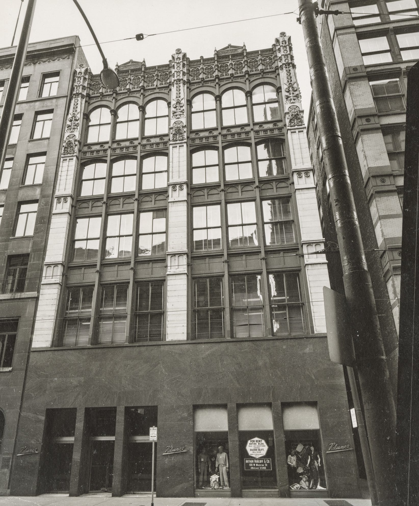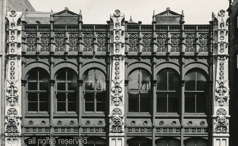 the downtown chicago commercial building was demolished in 1972 by national wrecking. multiple cast iron panels were salvaged and distributed to institutions during the building’s demolition.
