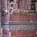 pouring over notes and photographs, i was hoping to jump start my memory of this salvage experience, which occurred sometime in 2009. i recall spending a great deal of time outside, trying to extract various salmon-colored, glazed terra cotta panels and/or blocks adorning the once grand entrance with its large arched opening. at the time the building was set for demolition, the city was so brutally cold and the wind from the lake nearly froze my face off. i remember being surrounded by at least a foot of snow, making it hard to erect a support system that would allow access to the highly intricate and deep relief floral rosettes comprising the arched surround. ironically, i was frustrated at the time by having to wear gloves; rarely do you see anyone on a jobsite without, but i just cannot stand them. i have paid dearly, in the form of stitches, broken fingers and blemished skin, and still i need to “feel” the tools, or the ornament i’m working on. gloves make me feel clumsy and disconnected from the work.