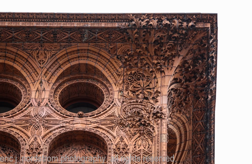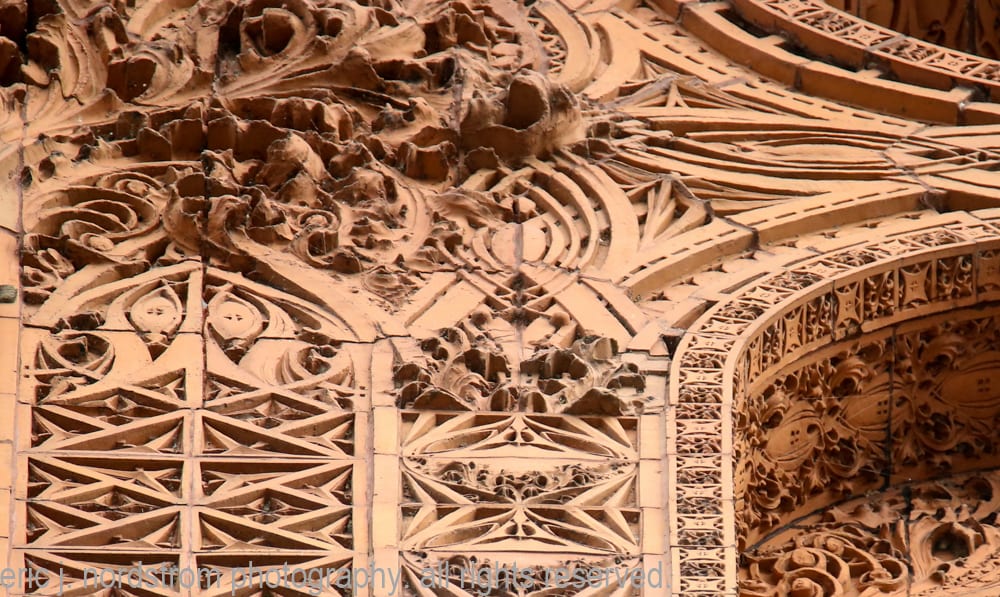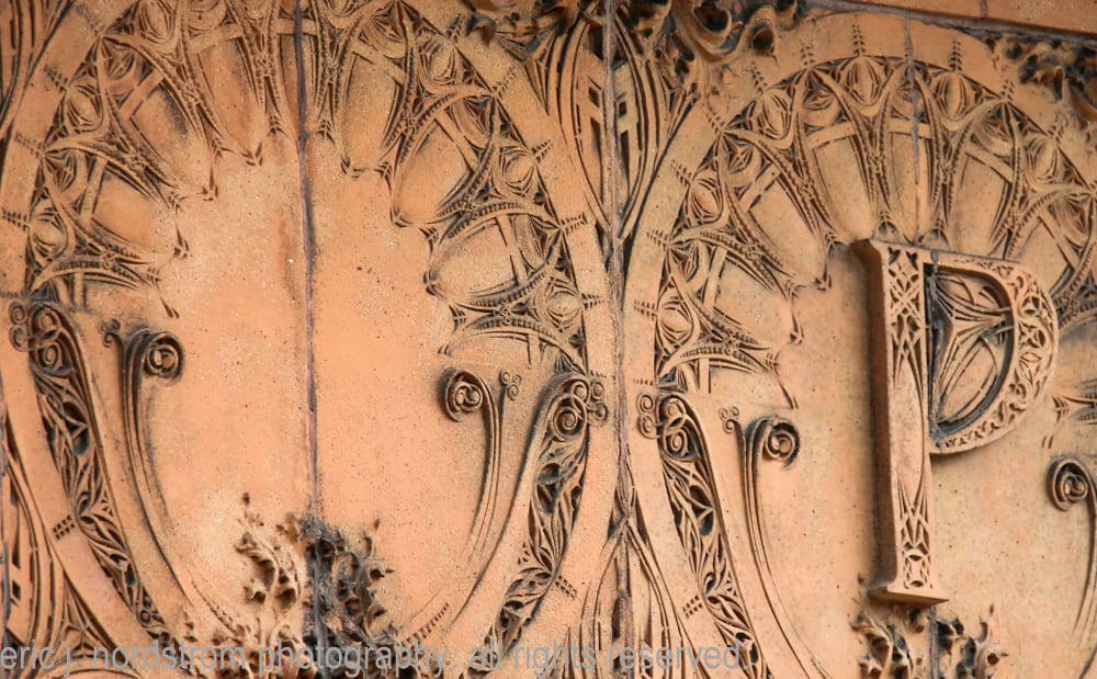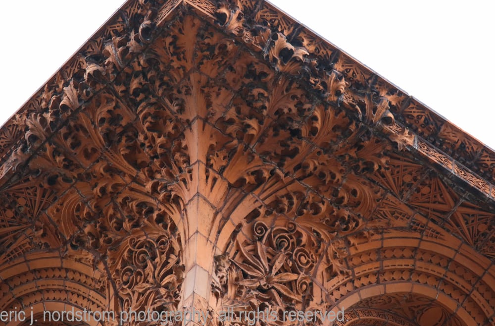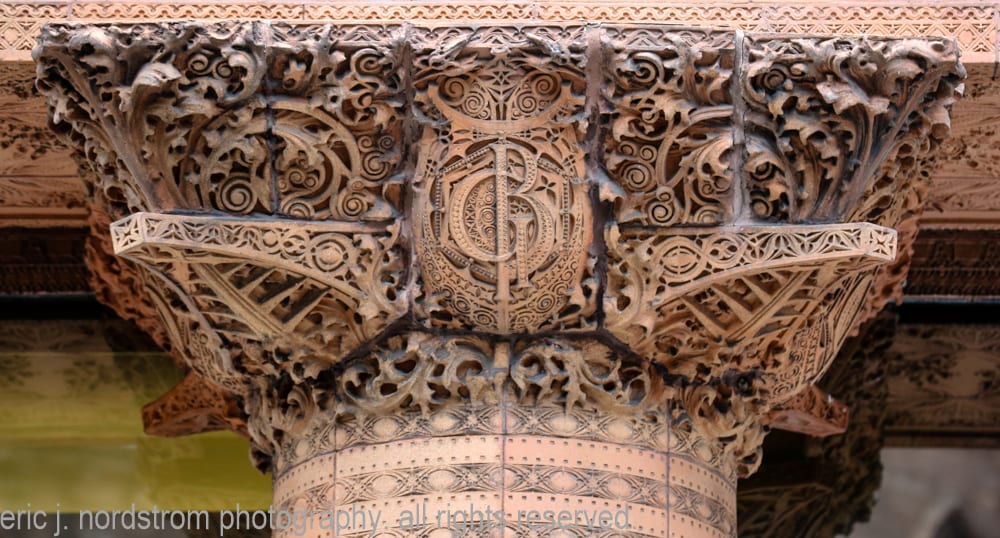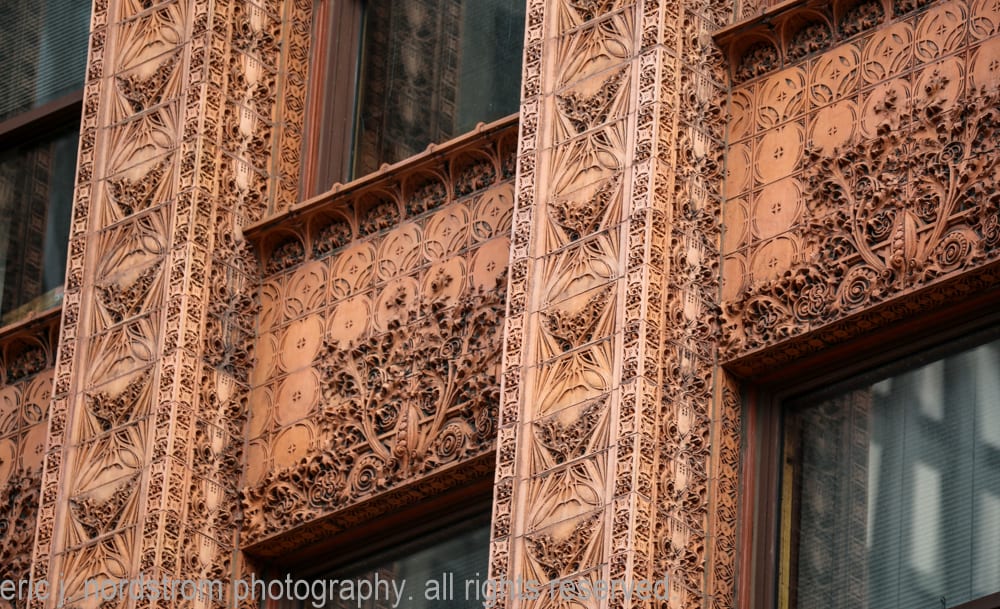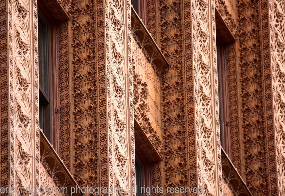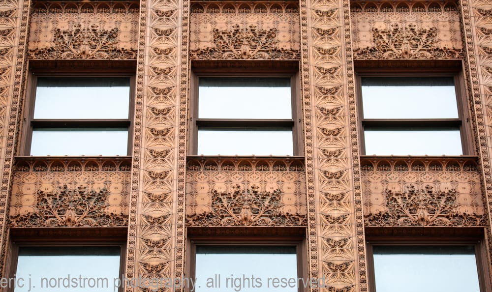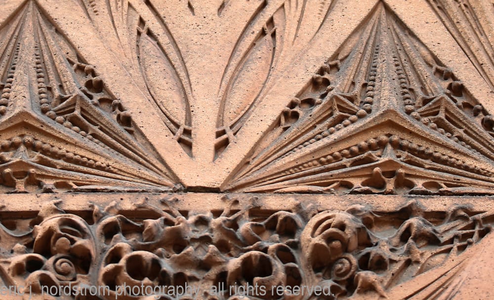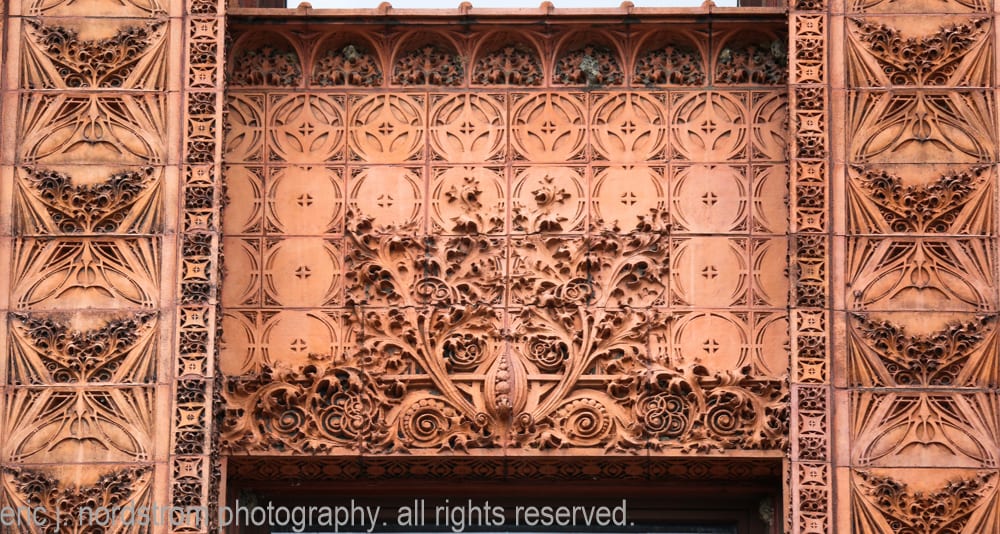 nearly a year later, i forced myself to devote a single afternoon to edit and post images of the building’s exterior ornament taken during that visit. the collection of images focus on the ornament’s plasticity in great detail. the terra cotta ornament was designed by louis h. sullivan and executed in 1896 by chicago-based northwestern terra cotta works. kristian schneider modeled the ornament under the guidance of sullivan and elmslie.