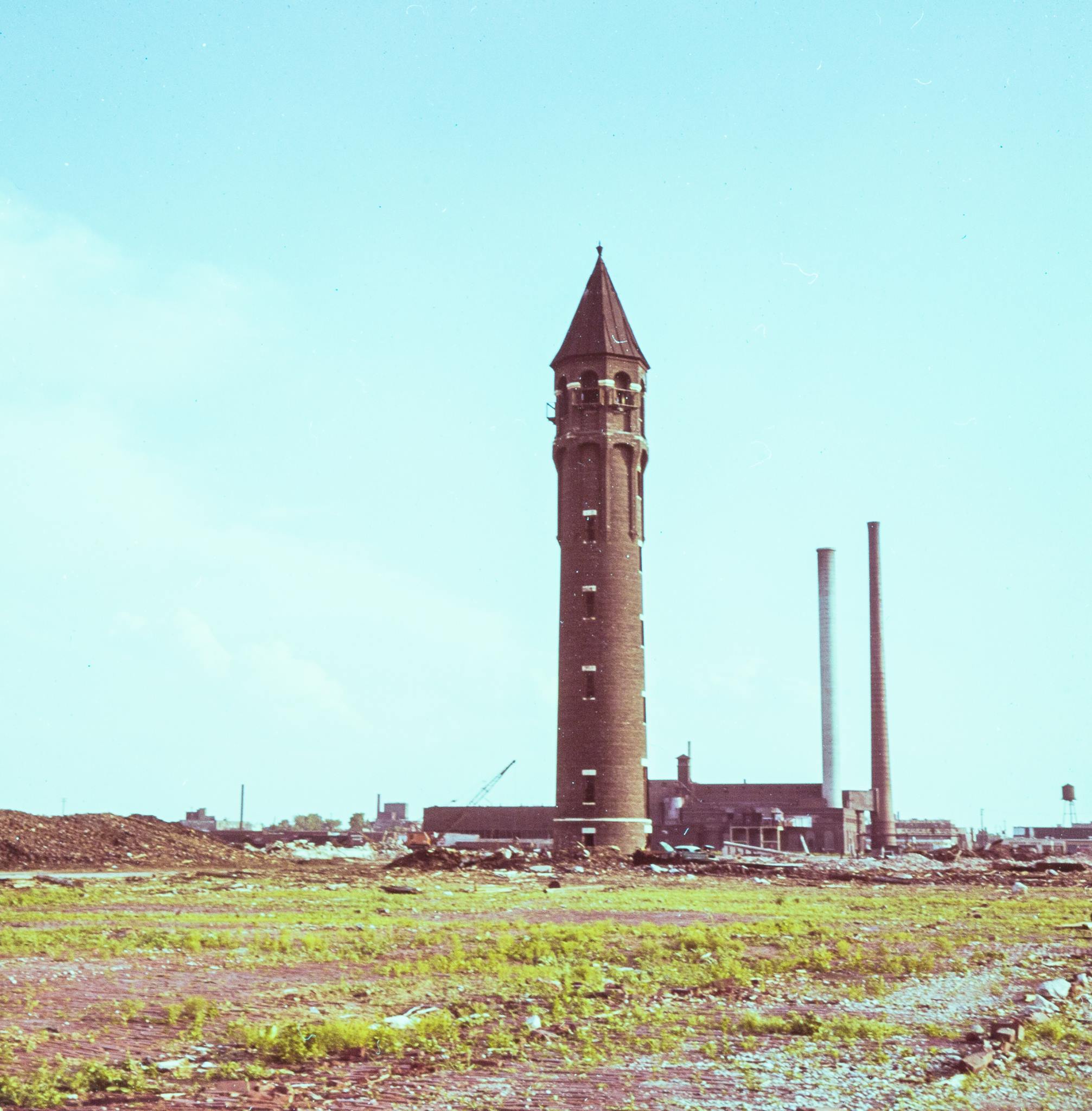 the gate and water tower observatory were the first two major structures built at the yards by burnham and root around 1897. the water tower was demolished in the 1960s.