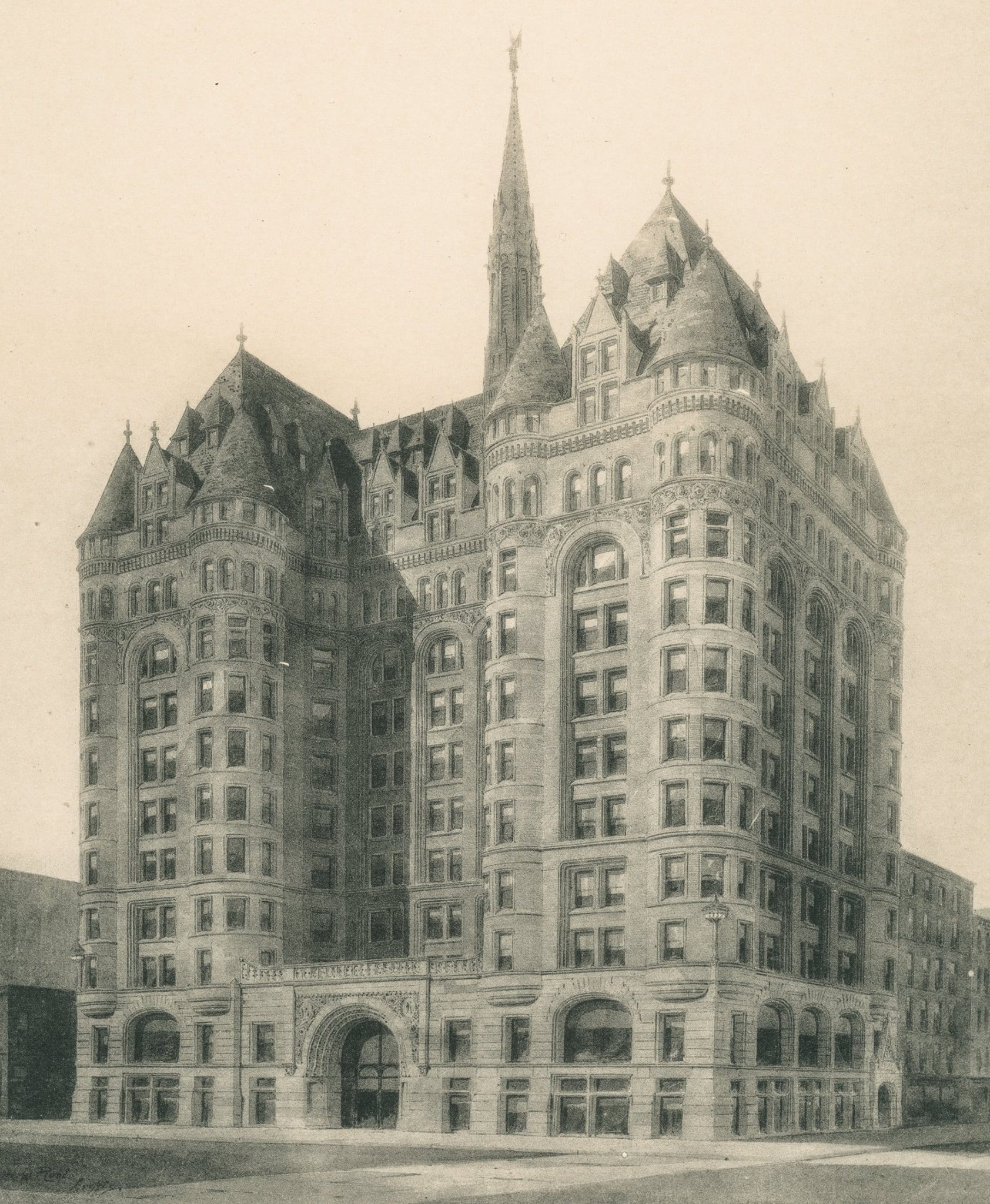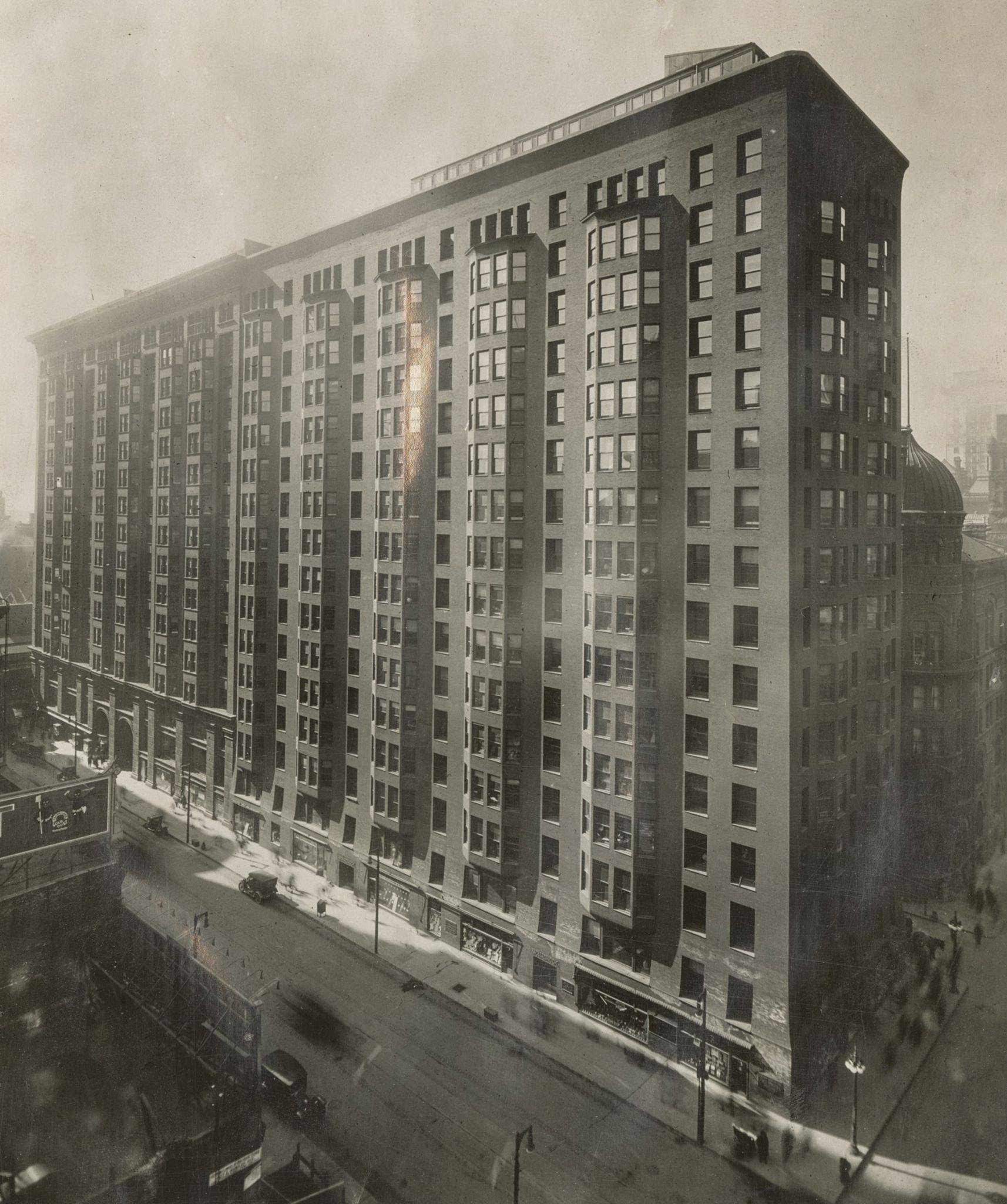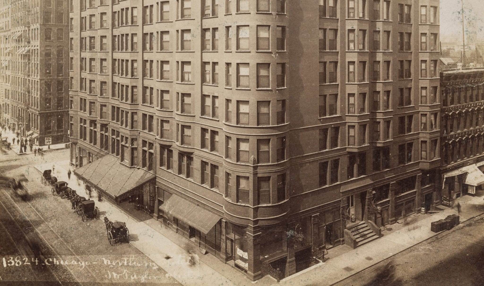 james w. taylor albumen print of burnham and root’s 16-story 500 room great northern hotel completed in 1891. the structure’s iron and steel framing was concealed with brick facade accentuated with small amounts of ornamental terra cotta executed by the northwestern terra cotta company.