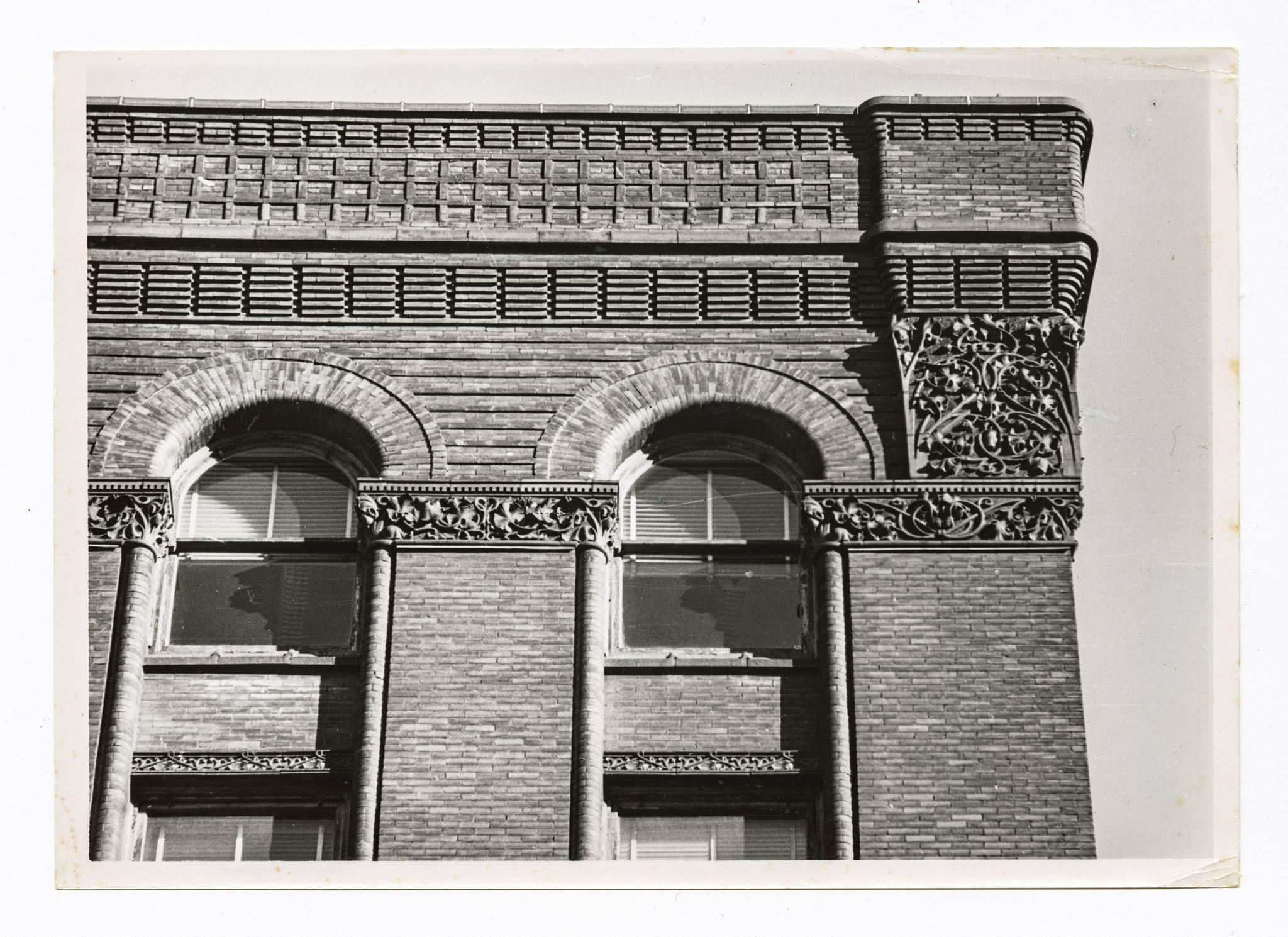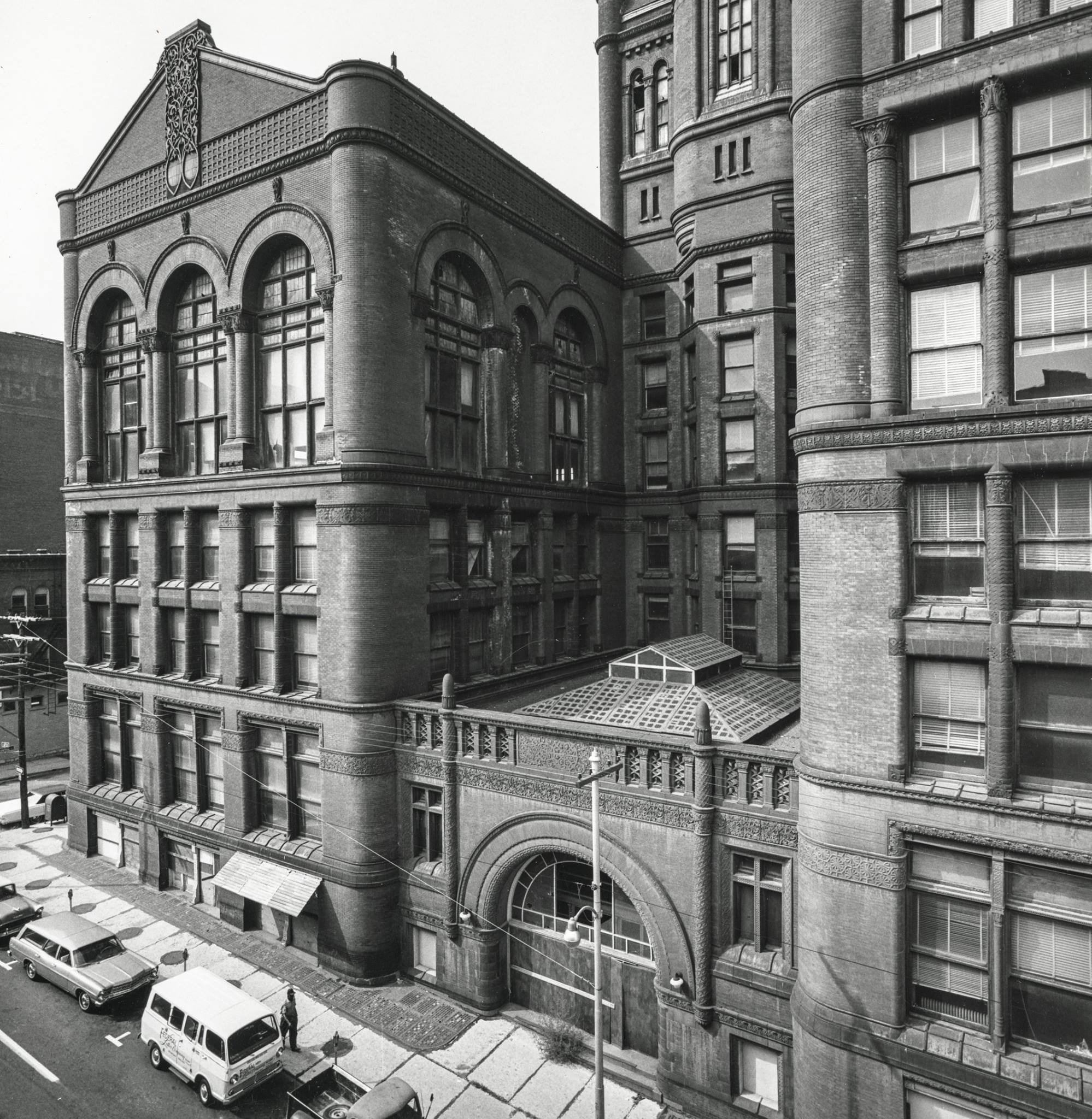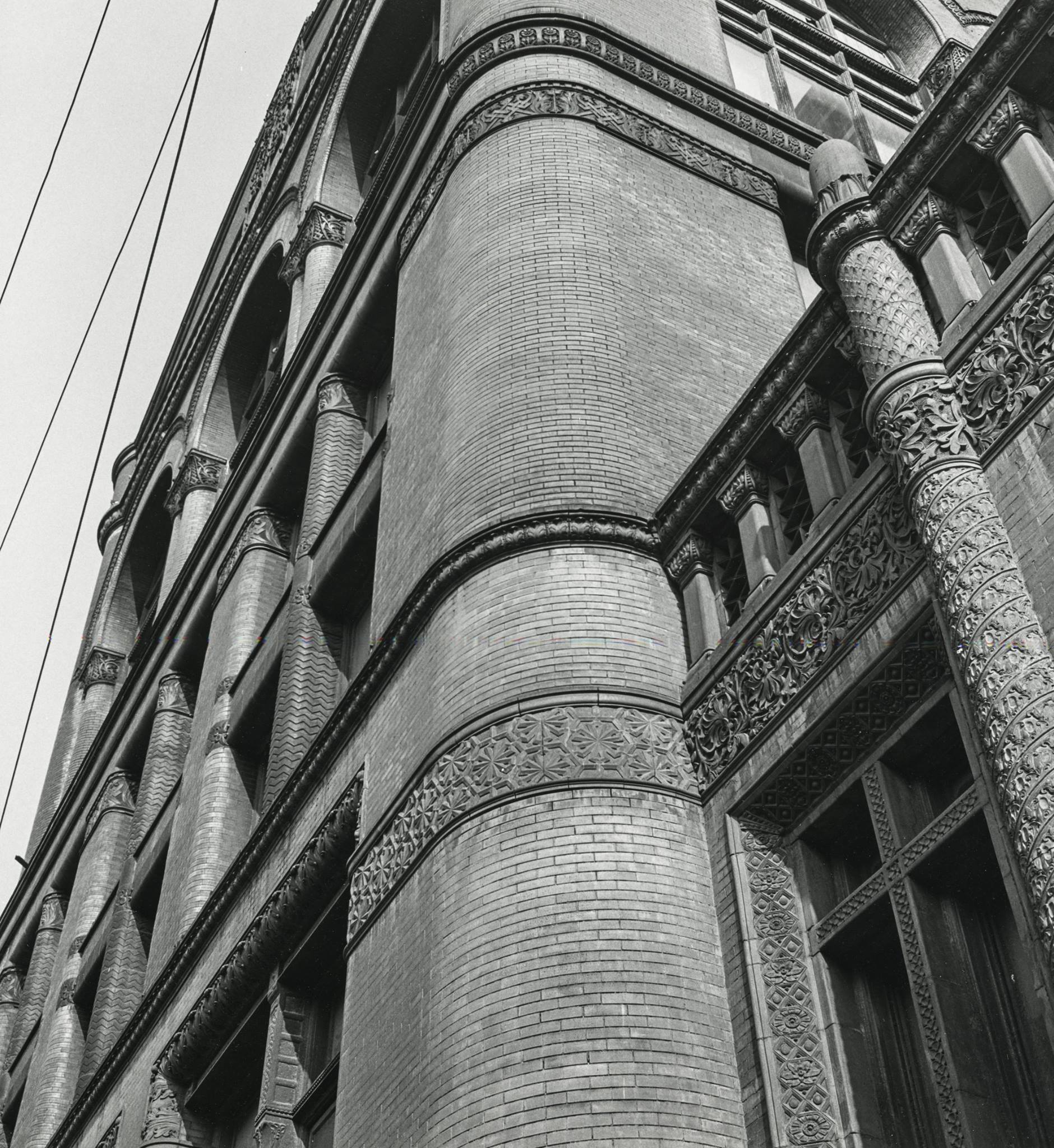 the exterior consisted of massive 35-foot walls comprised of rusticated or rock-faced michighan brownstone. the distinctive small slotted windows wrapped around the corner turrets were protected with wrought iron basket grating that still existed at the time of demolition.