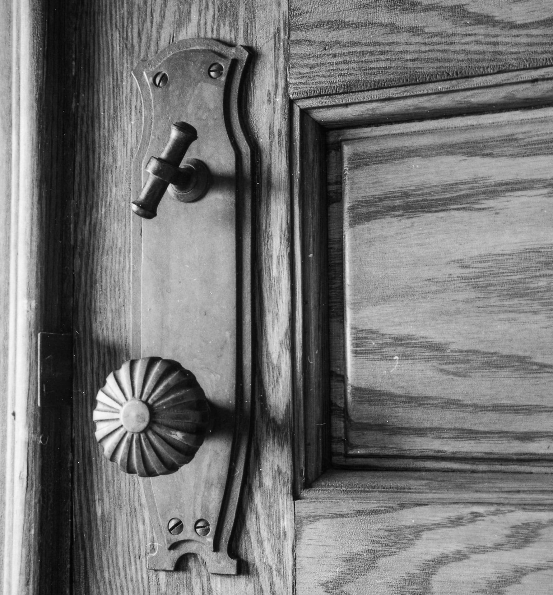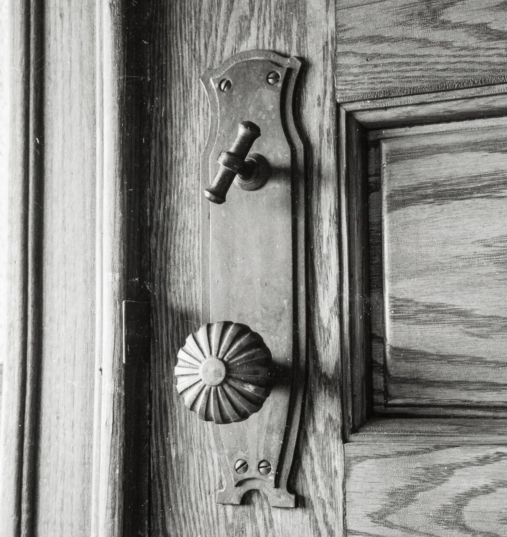 the image of the custom-designed interior office door handle and escutcheon (fabricated by yale and towne with bower-barff finish) from burnham and root’s kansas city board of trade building (1888) was photographed by richard nickel.