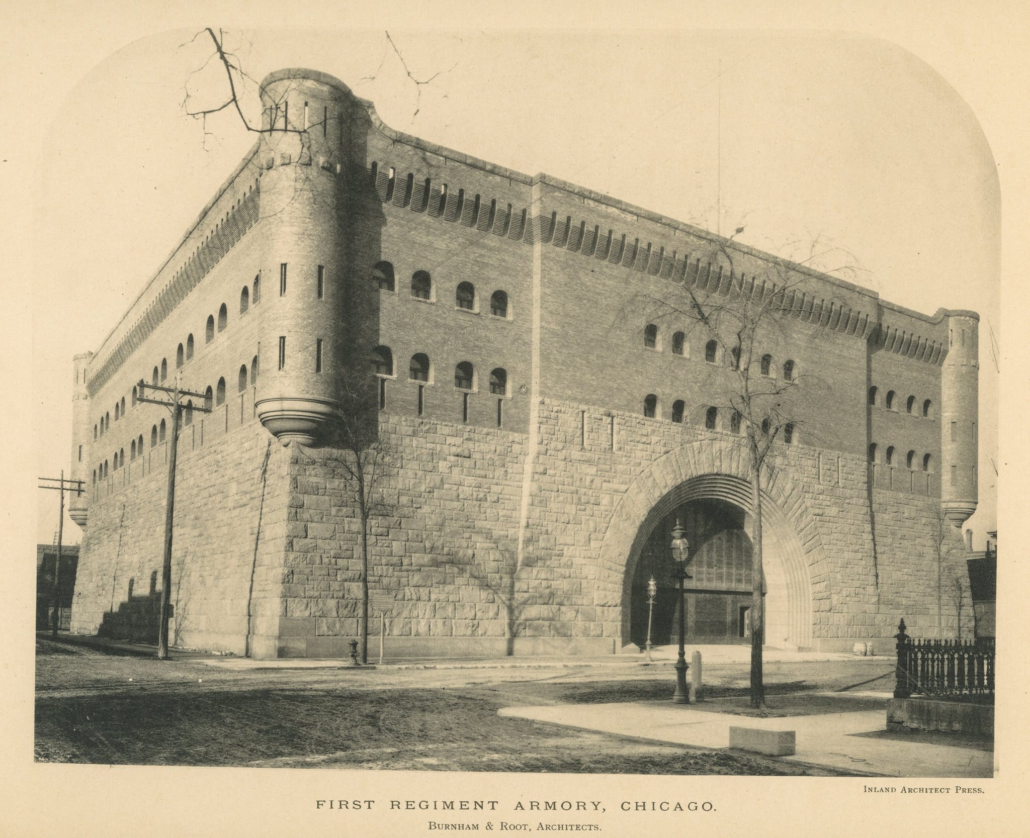 undated (likely early 20th century) image of burnham & root’s heavily fortified armory building (1891). the armory was demolished in 1967.