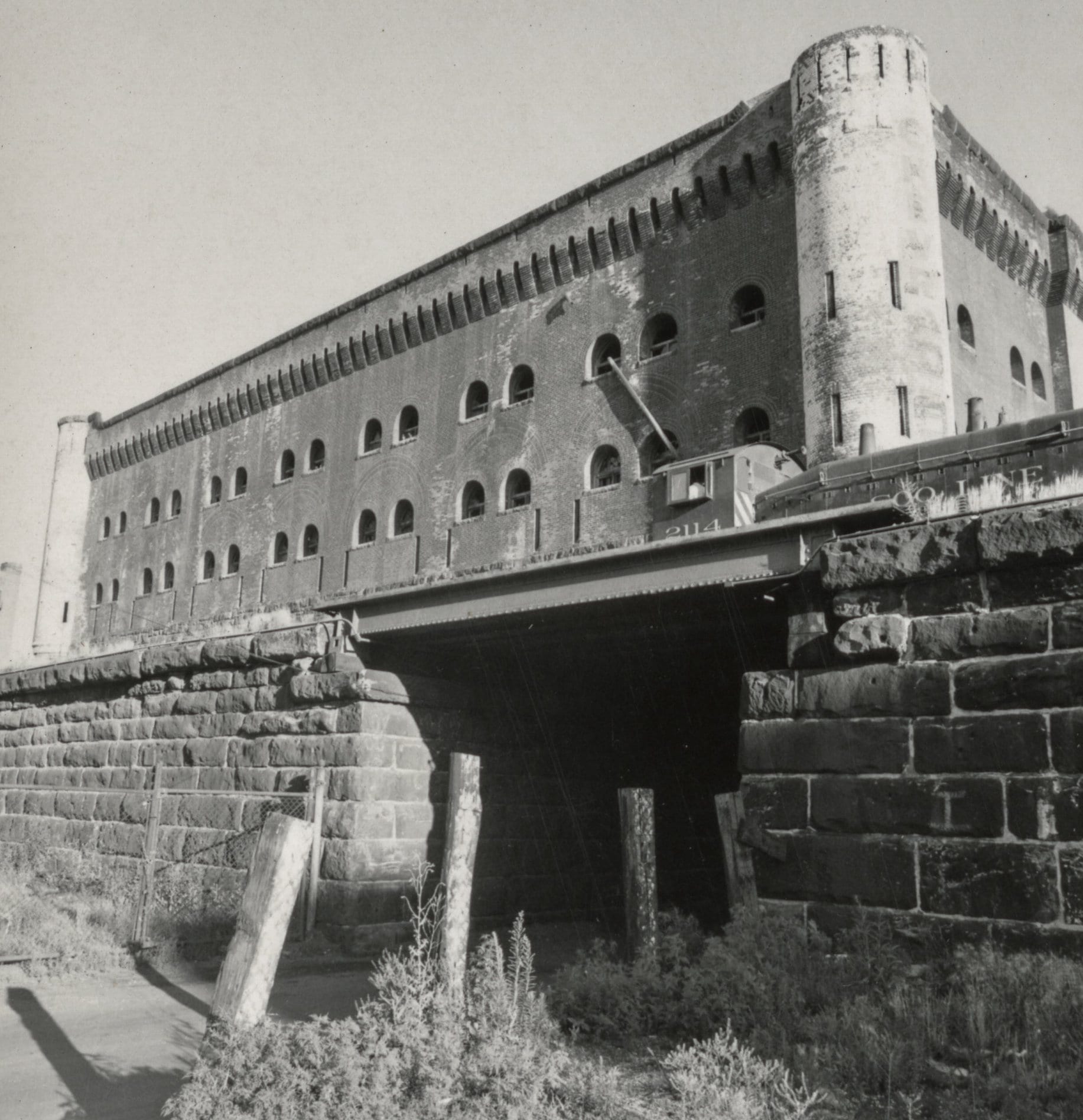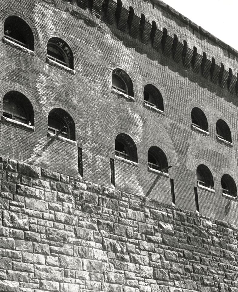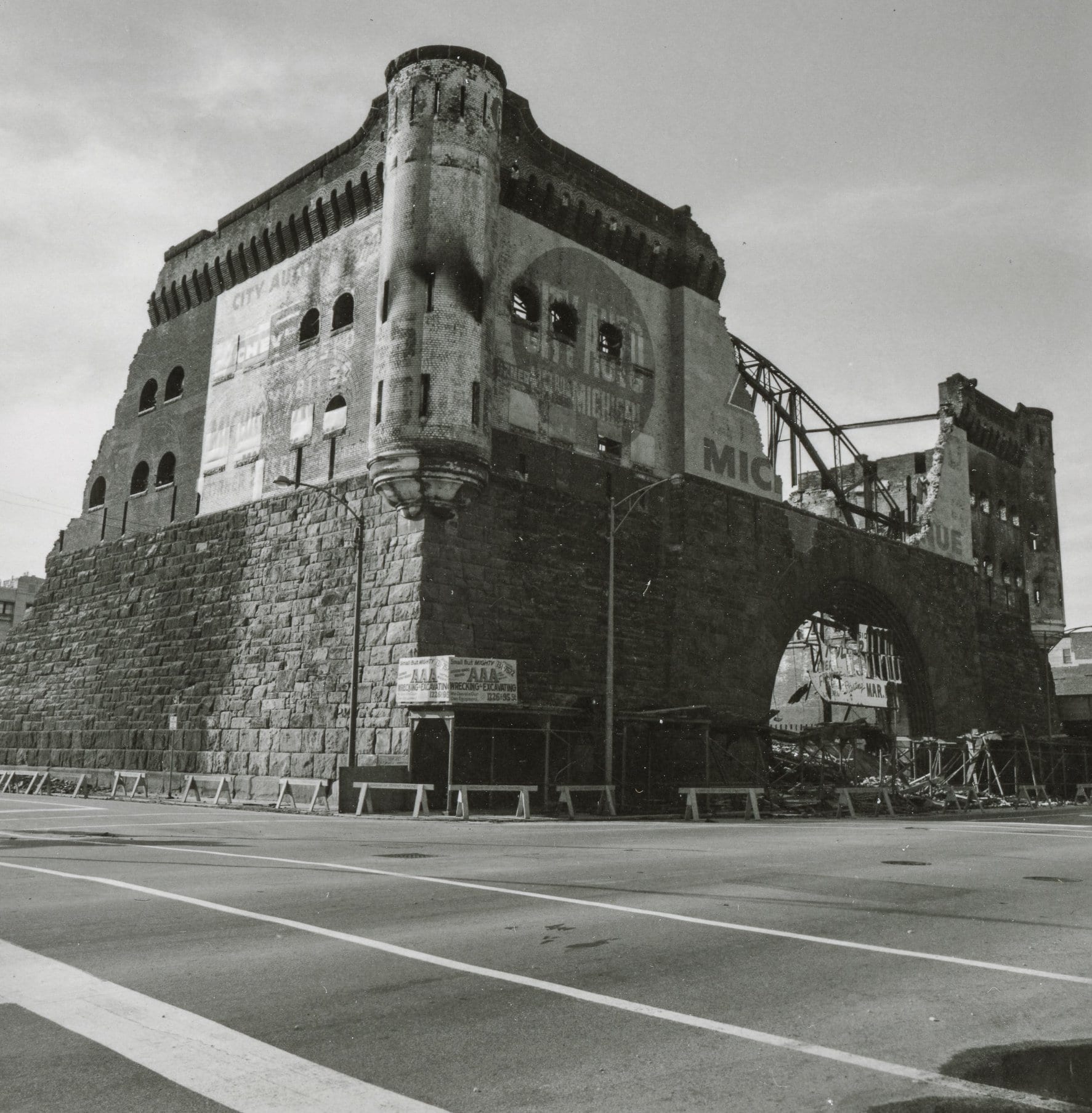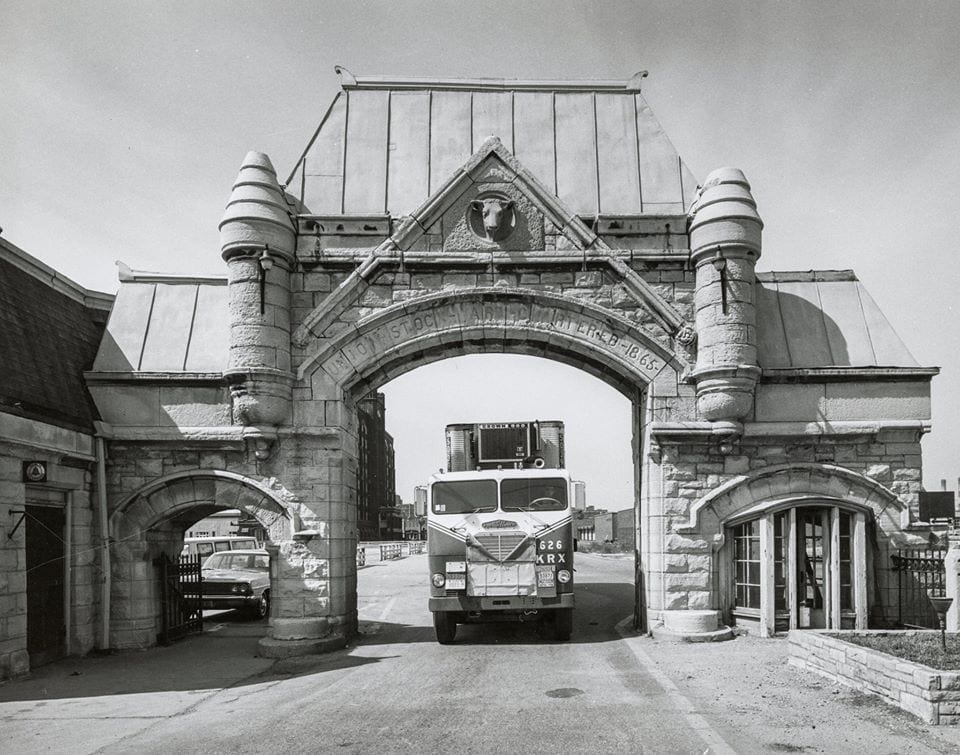 richard nickel image of the rusticated lemont limestone union stock yard gate as it appeared in april of 1971. the adjoining structure to the left (demolished) was used a police station or guard house.