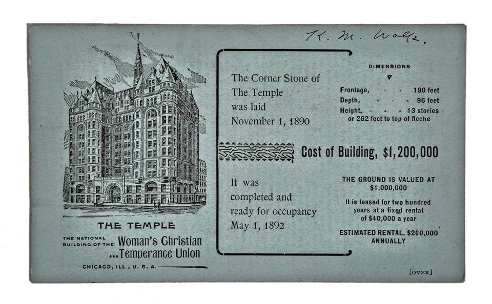 original woman’s temple building (1892, burnham and root) advertising card distributed to prospective office tenants.
