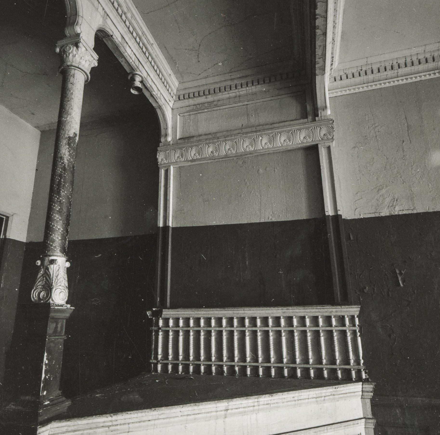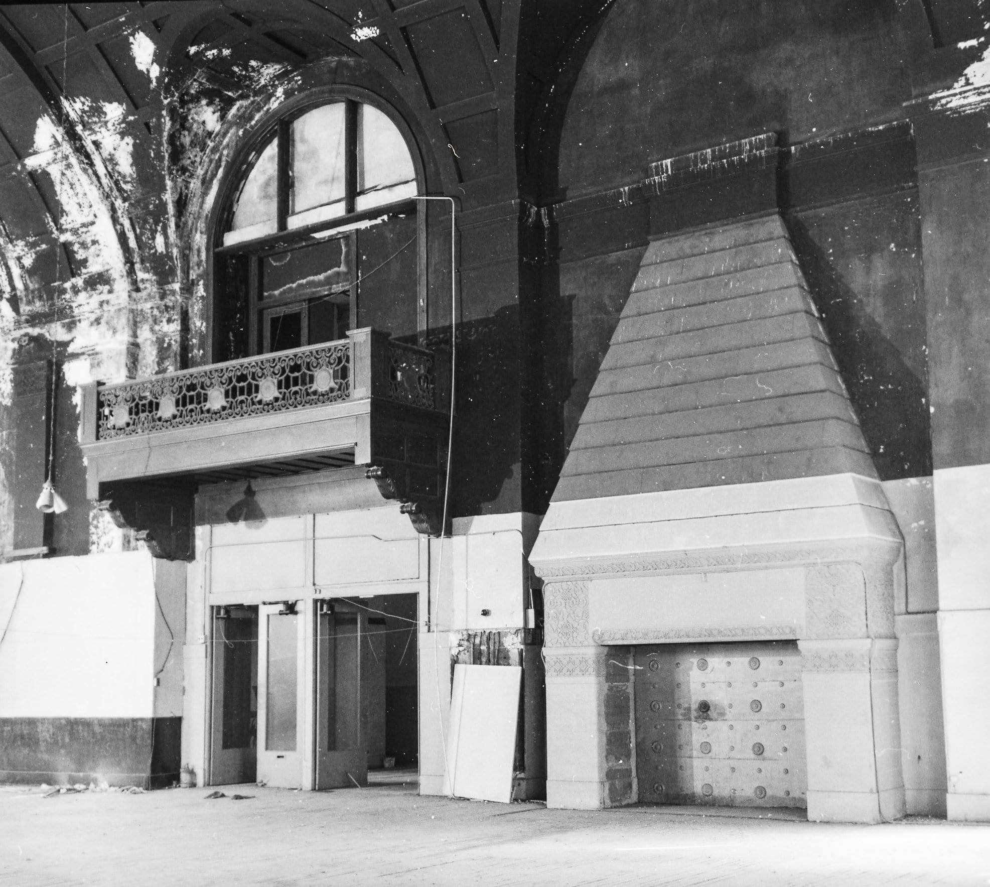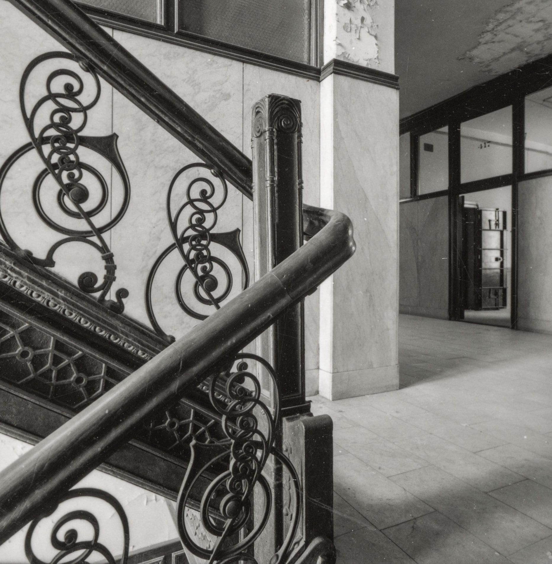 the original ornamental cast and wrought iron open-cage elevator with bower-barff finish was walled in during the 1930s-1940s – cannot recall exact date.