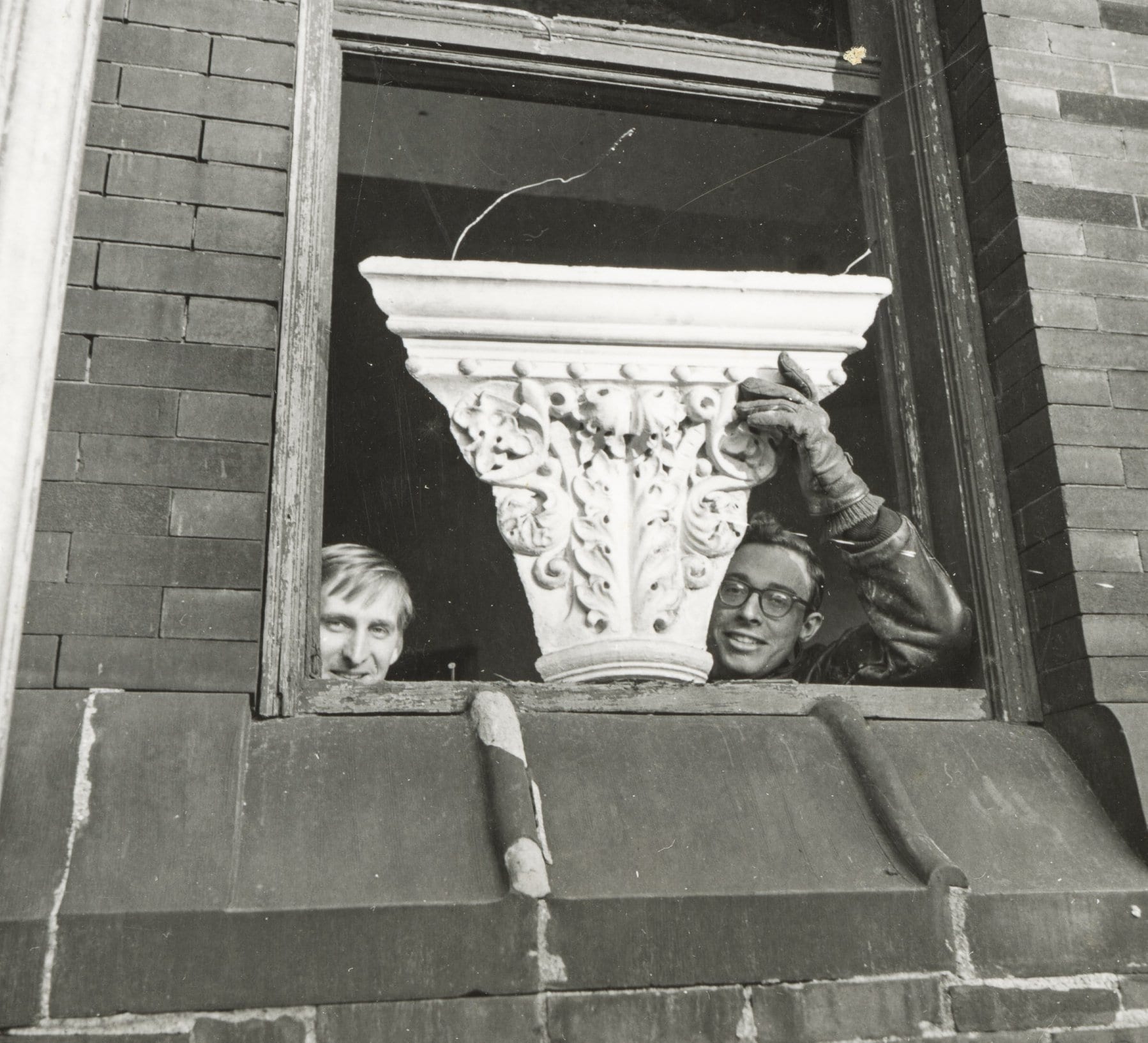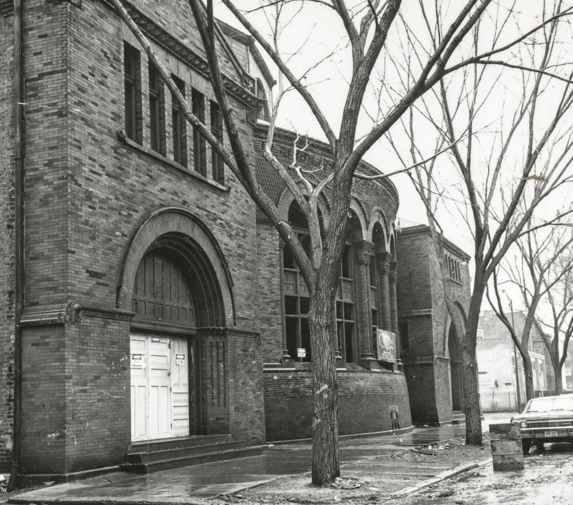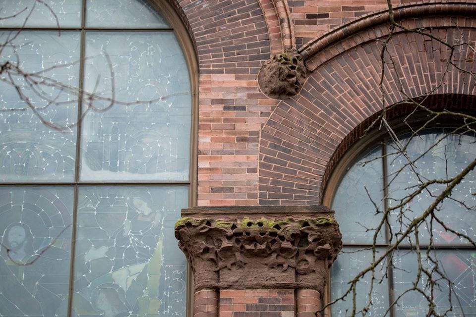 vinci, nickel, and david norris managed to salvaged architectural elements, including column capital panels (see image of norris in window), along with four-sided exterior red slip terra cotta heads between the long and narrow arched windows. the church was located at the southeast corner of halstad and belden.